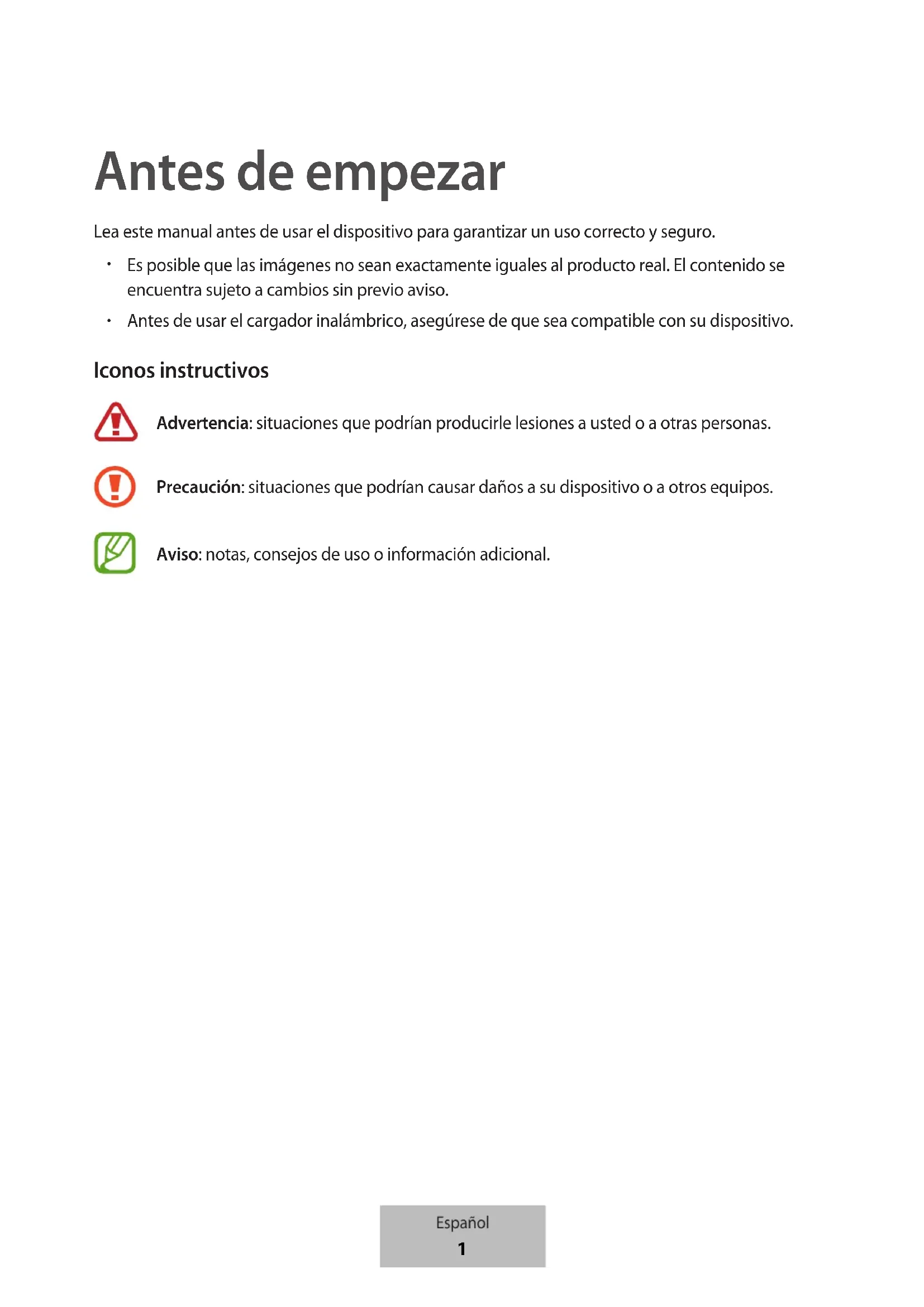 Antes de usar el cargador inalámbrico, asegúrese de que sea compatible con su dispositivo. Iconos instructivos Advertencia: situaciones que podrían producirle lesiones a usted o a otras personas. Precaución: situaciones que podrían causar daños a su dispositivo o a otros equipos. Aviso: notas, consejos de uso o información adicional. Español