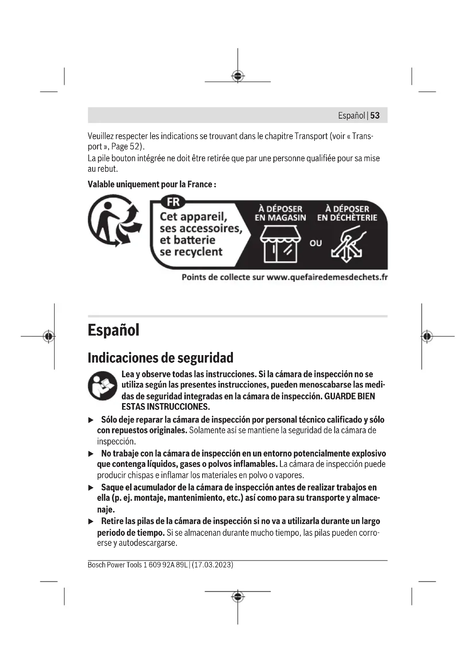 Con pantalla de la cámara, con funciónAutoUp, brillo medio de la pantalla, luz de la cámara con un 50% de brillo D) Con GBA12V2.0Ah E) depende de la batería utilizada Montaje Suministro de corriente La cámara de inspección puede funcionar con unaBosch batería de iones de litio, con pi- las convencionales o con baterías NiMH. El indicador de estado(d) de la pantalla muestra el nivel de carga de la batería de iones de litio, pilas o baterías NiMH. Funcionamiento con adaptador de pilas (verfiguraA) Las pilas o baterías NiMH se insertan en el adaptador de pilas. u El adaptador de pilas está determinado para usarlo exclusivamente en las previs- tas cámaras de inspección Bosch y no se debe utilizar con herramientas eléctri- cas. Para insertar las pilas o baterías, deslice la funda(22) del adaptador de pilas al compartimento(21). Coloque las pilas o las baterías en la funda tal y como lo indica la fi- gura que se encuentra en la caperuza de cierre(24). Deslice la caperuza de cierre sobre la funda hasta que encaje de forma audible y quede fija en el mango de la cámara de ins- pección. Para extraer las pilas o batería, presione las teclas de desenclavamiento(23) de la cape- ruza de cierre(24) y extraiga la caperuza de cierre. Extraiga la funda interior(22) del compartimento(21). Siempre sustituya todas las pilas o acumuladores al mismo tiempo. Solamente utilice pi- las o acumuladores del mismo fabricante e igual capacidad. u Retire las pilas o baterías de la cámara de inspección si no va a utilizarla durante mucho tiempo. Las pilas o baterías pueden corroerse y autodescargarse si se alma- cenan en la cámara de inspección durante mucho tiempo. Bosch Power Tools 1 609 92A 89L | (17.03.2023)60 | Español Funcionamiento con acumulador (verfiguraB) u Utilice únicamente los cargadores que se enumeran en los datos técnicos. Sola- mente estos cargadores han sido especialmente adaptados a los acumuladores de io- nes de litio empleados en su cámara de inspección. Indicación: Los acumuladores de iones de litio se entregan parcialmente cargados debi- do a la normativa de transporte internacional. Con el fin de obtener la plena potencia del acumulador, cargue completamente el acumulador antes de su primer uso. Para colocar el acumulador cargado(14) desplácelo en el compartimiento para el acumulador(21), hasta que encastre perceptiblemente y quede enrasado en el mango de la cámara de inspección. Para extraer el acumulador(14) presione las teclas de desenclavamiento(23) y extrai- ga el acumulador del compartimento(21). No proceda con brusquedad. Indicaciones para el trato óptimo del acumulador Proteja el acumulador de la humedad y del agua. Únicamente almacene el acumulador en el margen de temperatura desde −20°C hasta 50°C. P.ej., no deje el acumulador en el coche en verano. Si después de una recarga, el tiempo de funcionamiento del acumulador fuese muy redu- cido, ello es señal de que éste está agotado y deberá sustituirse. Observe las indicaciones referentes a la eliminación. Montaje del cable de la cámara (verfiguraC) Para operar la cámara de inspección, el cable de la cámara(1) debe montarse en el apa- rato portátil(13). Inserte el enchufe del cable de la cámara(1) en la conexión de la cámara(25) en la posi- ción correcta, hasta que encastre. Desmontaje del cable de la cámara (verfiguraD) Para quitar el cable de la cámara(1), comprima la retención(26) y saque el enchufe del aparato portátil(13). Montar el espejo, el imán o el gancho (verfiguraE) El espejo(29), el gancho(28) o el imán(27) se pueden montar como medios auxiliares en el cabezal de cámara(2). Introduzca uno de los 3medios en el cabezal de la cámara (2) hasta el tope, como se muestra en la figura. 1 609 92A 89L | (17.03.2023) Bosch Power ToolsEspañol | 61 Indicación: El imán(27) y el gancho(28) sólo son adecuados para mover y retirar obje- tos sueltos, pequeños y livianos. En caso de una tensión excesiva, se puede dañar la cá- mara de inspección o el medio auxiliar. Funcionamiento u Proteja el dispositivo portátil y la batería o el adaptador de pilas de la radiación solar directa. Proteja la batería o el adaptador de pilas de la humedad. El cable de la cámara(1) y el cabezal de la cámara(2) son impermeables si se han instalado co- rrectamente; el dispositivo portátil(13) es resistente a las salpicaduras. Sin embar- go, la batería(14) y el adaptador de pilas no están protegidos contra el agua. En caso de contacto con agua, existe el riesgo de descarga eléctrica o daños. u No utilice la cámara de inspección si el lente del cabezal de la cámara(2) está empañado. Conecte la cámara de inspección recién una vez que se haya evapora- do la humedad. En caso contrario se puede dañar la cámara de inspección. u La lámpara(3) conectada puede calentarse durante el funcionamiento. No toque la lámpara para evitar quemaduras. u No exponga la cámara de inspección a temperaturas extremas o fluctuaciones de temperatura. No los deje p. ej. durante un tiempo prolongado en el automóvil. En ca- so de fuertes fluctuaciones de temperatura, deje que se estabilice primero la tempe- ratura de la cámara de inspección antes de la puesta en servicio. Puesta en servicio Conexión/desconexión Para encender la cámara de inspección, pulse el botón de conexión/desconexión(6) o el botón central(9). Indicación: Si el cable de la cámara no está montado cuando se conecta la alimentación, la pantalla muestra un mensaje de error. Para apagar la cámara de inspección, presione de nuevo el botón de conexión/ desconexión(6) hasta que la pantalla se apague. Si no se pulsa ningún botón de la cámara de inspección durante algún tiempo, esta se apaga automáticamente para ahorrar batería. Puede definir el tiempo de desconexión en el menú principal. Ajuste de la lámpara en el cabezal de cámara Para regular la luz, pulse la tecla izquierda(8) o la tecla derecha(11) repetida