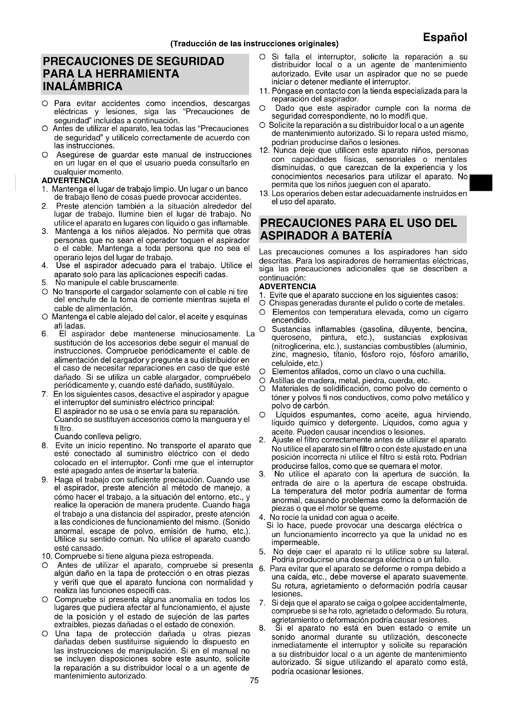 Las precauciones comunes a los aspiradores han sido descritas. Para los aspiradores de herramientas eléctricas, siga las precauciones adicionales que se describen a continuación: ADVERTENCIA