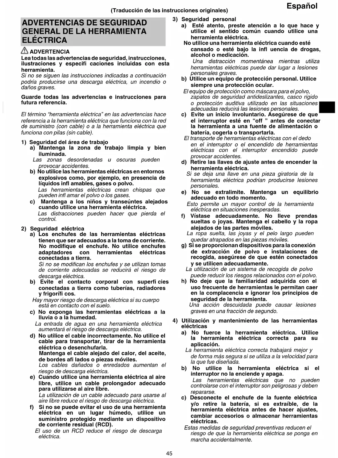 a) Los enchufes de las herramientas eléctricas tienen que ser adecuados a la toma de corriente. No modifi que el enchufe. No utilice enchufes adaptadores con herramientas eléctricas conectadas a tierra. Si no se modifi can los enchufes y se utilizan tomas de corriente adecuadas se reducirá el riesgo de descarga eléctrica. b) Evite el contacto corporal con superfi cies conectadas a tierra como tuberías, radiadores y frigorífi cos. Hay mayor riesgo de descarga eléctrica si su cuerpo está en contacto con el suelo. c) No exponga las herramientas eléctricas a la lluvia o a la humedad. La entrada de agua en una herramienta eléctrica aumentará el riesgo de descarga eléctrica. d) No utilice el cable incorrectamente. No utilice el cable para transportar, tirar de la herramienta eléctrica o desenchufarla. Mantenga el cable alejado del calor, del aceite, de bordes afi lados o piezas móviles. Los cables dañados o enredados aumentan el riesgo de descarga eléctrica. e) Cuando utilice una herramienta eléctrica al aire libre, utilice un cable prolongador adecuado para utilizarse al aire libre. La utilización de un cable adecuado para usarse al aire libre reduce el riesgo de descarga eléctrica. f) Si no se puede evitar el uso de una herramienta eléctrica en un lugar húmedo, utilice un suministro protegido mediante un dispositivo de corriente residual (RCD). El uso de un RCD reduce el riesgo de descarga eléctrica. (Traducción de las instrucciones originales) 0000BookCV12DA.indb450000BookCV12DA.indb45 2019/12/1612:36:522019/12/1612:36:5246 Español d) Guarde las herramientas eléctricas que no se utilicen fuera del alcance de los niños, y no permita que utilicen las herramientas eléctricas personas no familiarizadas con las mismas o con estas instrucciones. Las herramientas eléctricas son peligrosas si son utilizadas por usuarios sin formación. e) Realice el mantenimiento de las herramientas eléctricas y accesorios. Compruebe si las piezas móviles están mal alineadas o unidas, si hay alguna pieza rota u otra condición que pudiera afectar al funcionamiento de las herramientas eléctricas. Si la herramienta eléctrica está dañada, llévela a reparar antes de utilizarla. Se producen muchos accidentes por no realizar un mantenimiento correcto de las herramientas eléctricas. f) Mantenga las herramientas de corte afi ladas y limpias. Las herramientas de corte correctamente mantenidas con los bordes de corte afi lados son más fáciles de controlar, y existe menor riesgo de que se atasquen. g) Utilice la herramienta eléctrica, los accesorios y las brocas de la herramienta, etc. de acuerdo con estas instrucciones, teniendo en cuenta las condiciones de trabajo y el trabajo que se va a realizar. La utilización de la herramienta eléctrica para operaciones diferentes a las previstas podría dar lugar a una situación peligrosa. h) Mantenga los mangos y las superfi cies de agarre secas, limpias y libres de aceite y grasa. Los mangos y las superfi cies de agarre resbaladizos no permiten el manejo y el control seguros de la herramienta en situaciones inesperadas.