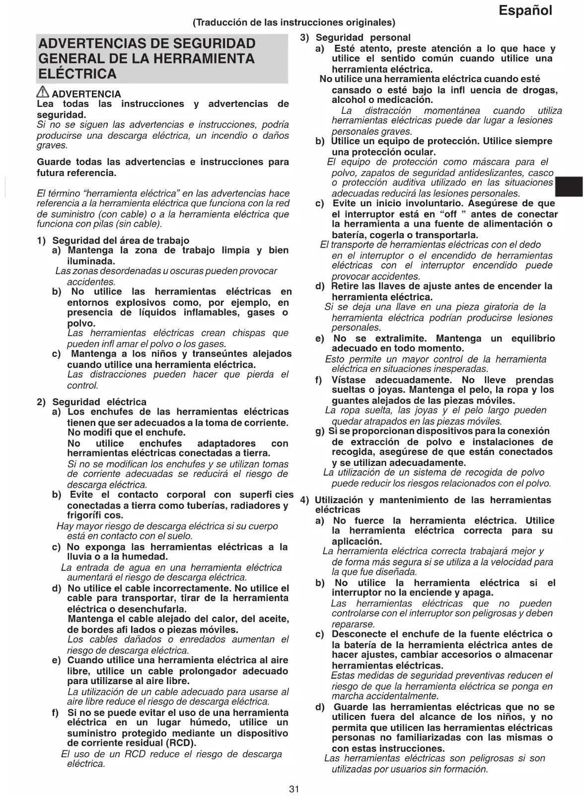 ELÉCTRICA ADVERTENCIA Lea todas las instrucciones y advertencias de seguridad. Si no se siguen las advertencias e instrucciones, podría producirse una descarga eléctrica, un incendio o daños graves. Guarde todas las advertencias e instrucciones para futura referencia. El término “herramienta eléctrica” en las advertencias hace referencia a la herramienta eléctrica que funciona con la red de suministro (con cable) o a la herramienta eléctrica que funciona con pilas (sin cable).