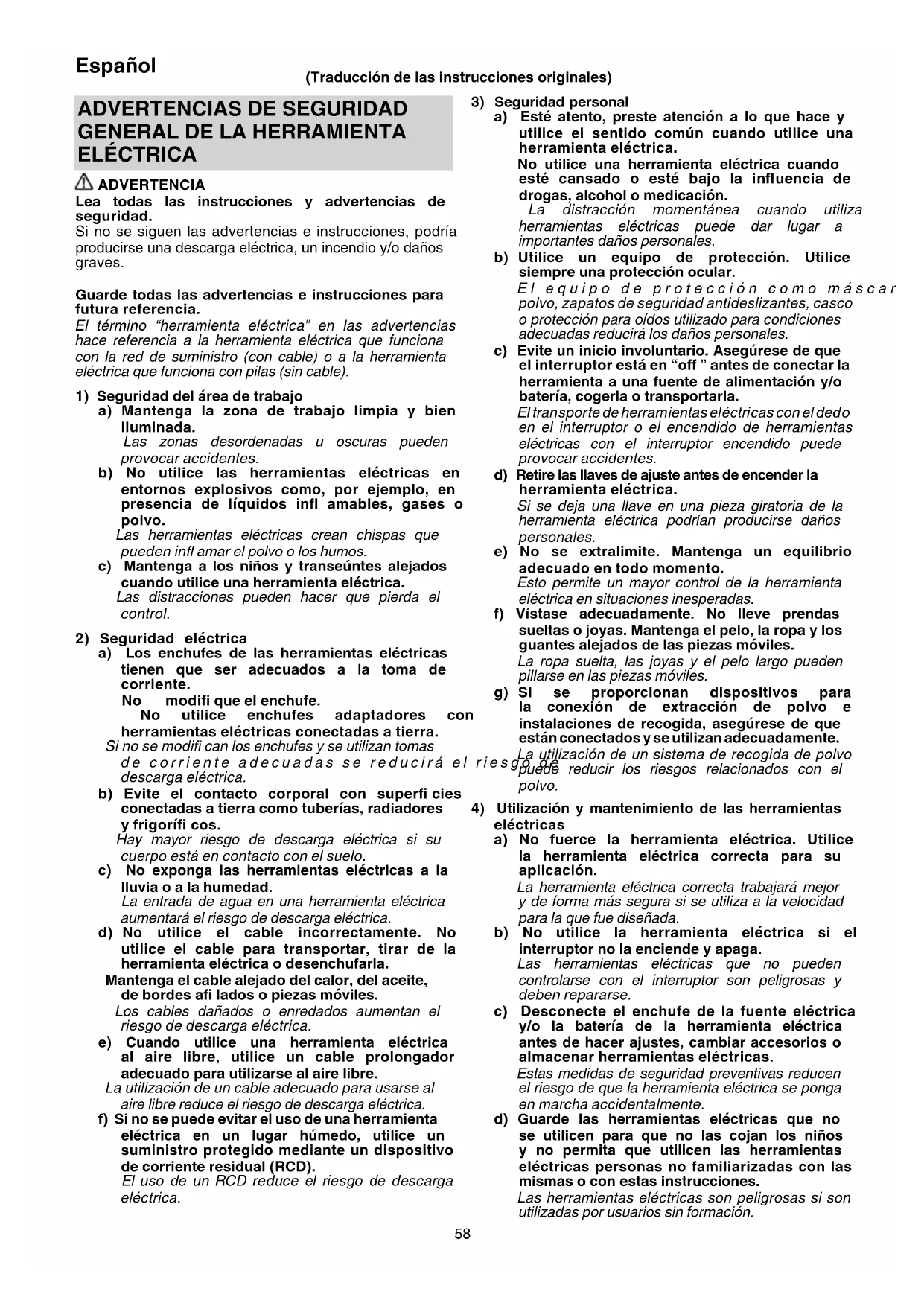 ELÉCTRICA ADVERTENCIA Lea todas las instrucciones y advertencias de seguridad. Si no se siguen las advertencias e instrucciones, podría producirse una descarga eléctrica, un incendio y/o daños graves. Guarde todas las advertencias e instrucciones para futura referencia. El término “herramienta eléctrica” en las advertencias hace referencia a la herramienta eléctrica que funciona con la red de suministro (con cable) o a la herramienta eléctrica que funciona con pilas (sin cable).