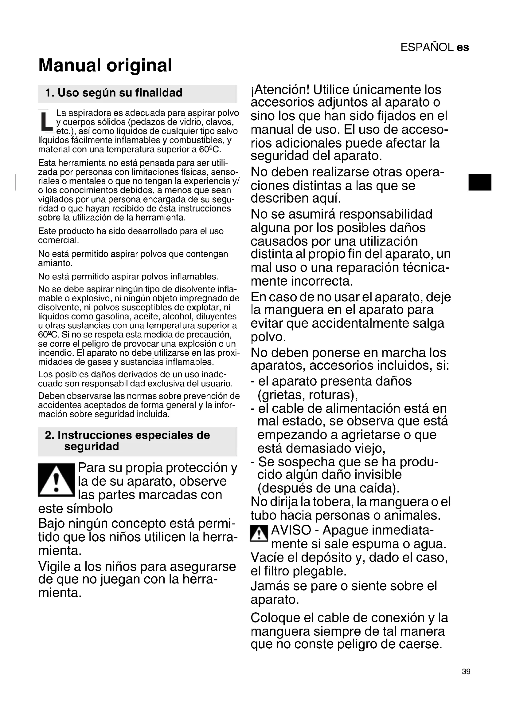 Manual original La aspiradora es adecuada para aspirar polvo y cuerpos sólidos (pedazos de vidrio, clavos, etc.), así como líquidos de cualquier tipo salvo líquidos fácilmente inflamables y combustibles, y material con una temperatura superior a 60ºC. Esta herramienta no está pensada para ser utili- zada por personas con limitaciones físicas, senso- riales o mentales o que no tengan la experiencia y/ o los conocimientos debidos, a menos que sean vigilados por una persona encargada de su segu- ridad o que hayan recibido de ésta instrucciones sobre la utilización de la herramienta. Este producto ha sido desarrollado para el uso comercial. No está permitido aspirar polvos que contengan amianto. No está permitido aspirar polvos inflamables. No se debe aspirar ningún tipo de disolvente infla- mable o explosivo, ni ningún objeto impregnado de disolvente, ni polvos susceptibles de explotar, ni líquidos como gasolina, aceite, alcohol, diluyentes u otras sustancias con una temperatura superior a 60ºC. Si no se respeta esta medida de precaución, se corre el peligro de provocar una explosión o un incendio. El aparato no debe utilizarse en las proxi- midades de gases y sustancias inflamables. Los posibles daños derivados de un uso inade- cuado son responsabilidad exclusiva del usuario. Deben observarse las normas sobre prevención de accidentes aceptados de forma general y la infor- mación sobre seguridad incluida. Para su propia protección y la de su aparato, observe las partes marcadas con este símbolo Bajo ningún concepto está permi- tido que los niños utilicen la herra- mienta. Vigile a los niños para asegurarse de que no juegan con la herra- mienta. ¡Atención! Utilice únicamente los accesorios adjuntos al aparato o sino los que han sido fijados en el manual de uso. El uso de acceso- rios adicionales puede afectar la seguridad del aparato. No deben realizarse otras opera- ciones distintas a las que se describen aquí. No se asumirá responsabilidad alguna por los posibles daños causados por una utilización distinta al propio fin del aparato, un mal uso o una reparación técnica- mente incorrecta. En caso de no usar el aparato, deje la manguera en el aparato para evitar que accidentalmente salga polvo. No deben ponerse en marcha los aparatos, accesorios incluidos, si: - el aparato presenta daños (grietas, roturas), - el cable de alimentación está en mal estado, se observa que está empezando a agrietarse o que está demasiado viejo, - Se sospecha que se ha produ- cido algún daño invisible (después de una caída). No dirija la tobera, la manguera o el tubo hacia personas o animales. AVISO - Apague inmediata- mente si sale espuma o agua. Vacíe el depósito y, dado el caso, el filtro plegable. Jamás se pare o siente sobre el aparato. Coloque el cable de conexión y la manguera siempre de tal manera que no conste peligro de caerse.