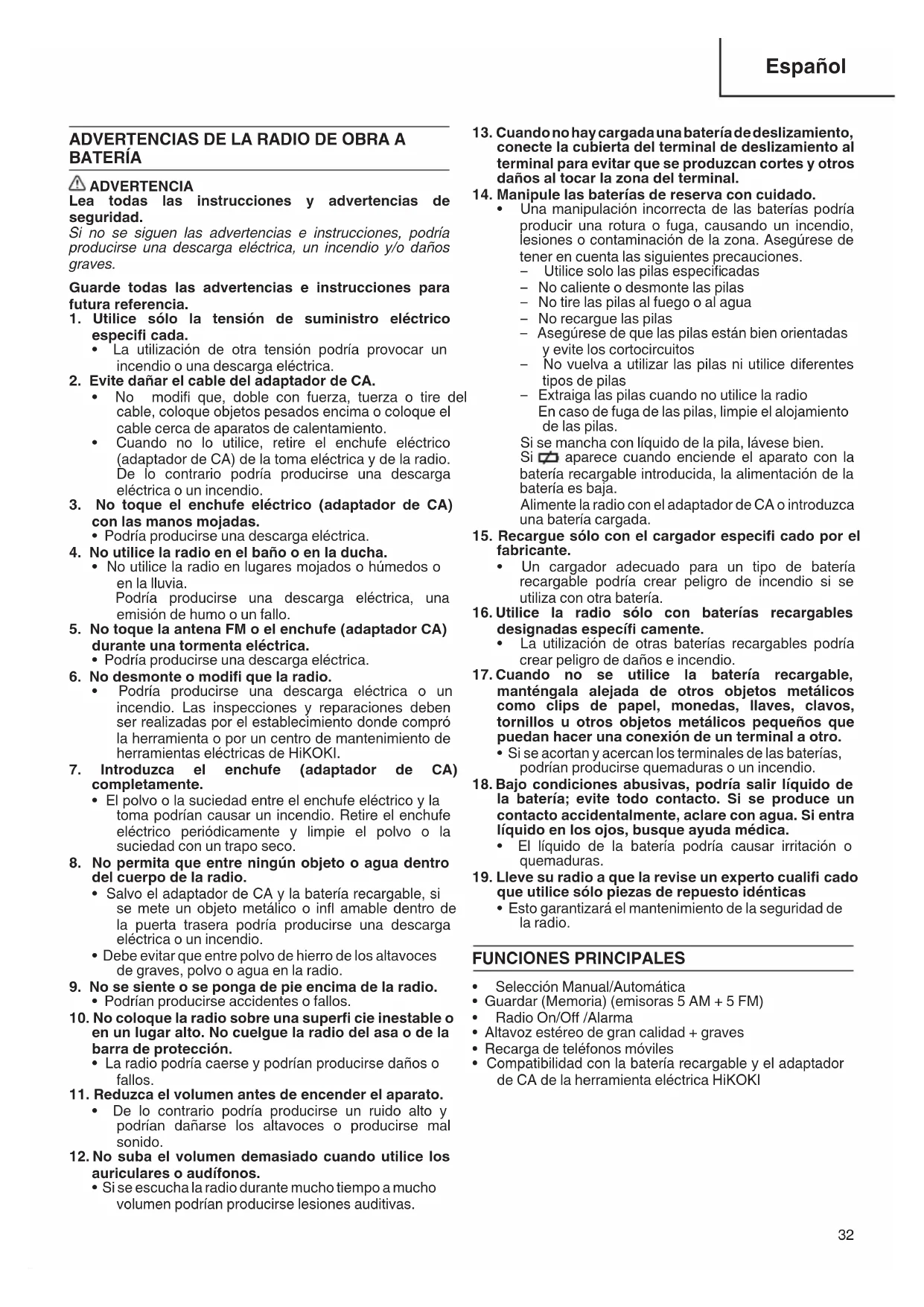 - Esto garantizará el mantenimiento de la seguridad de la radio. FUNCIONES PRINCIPALES