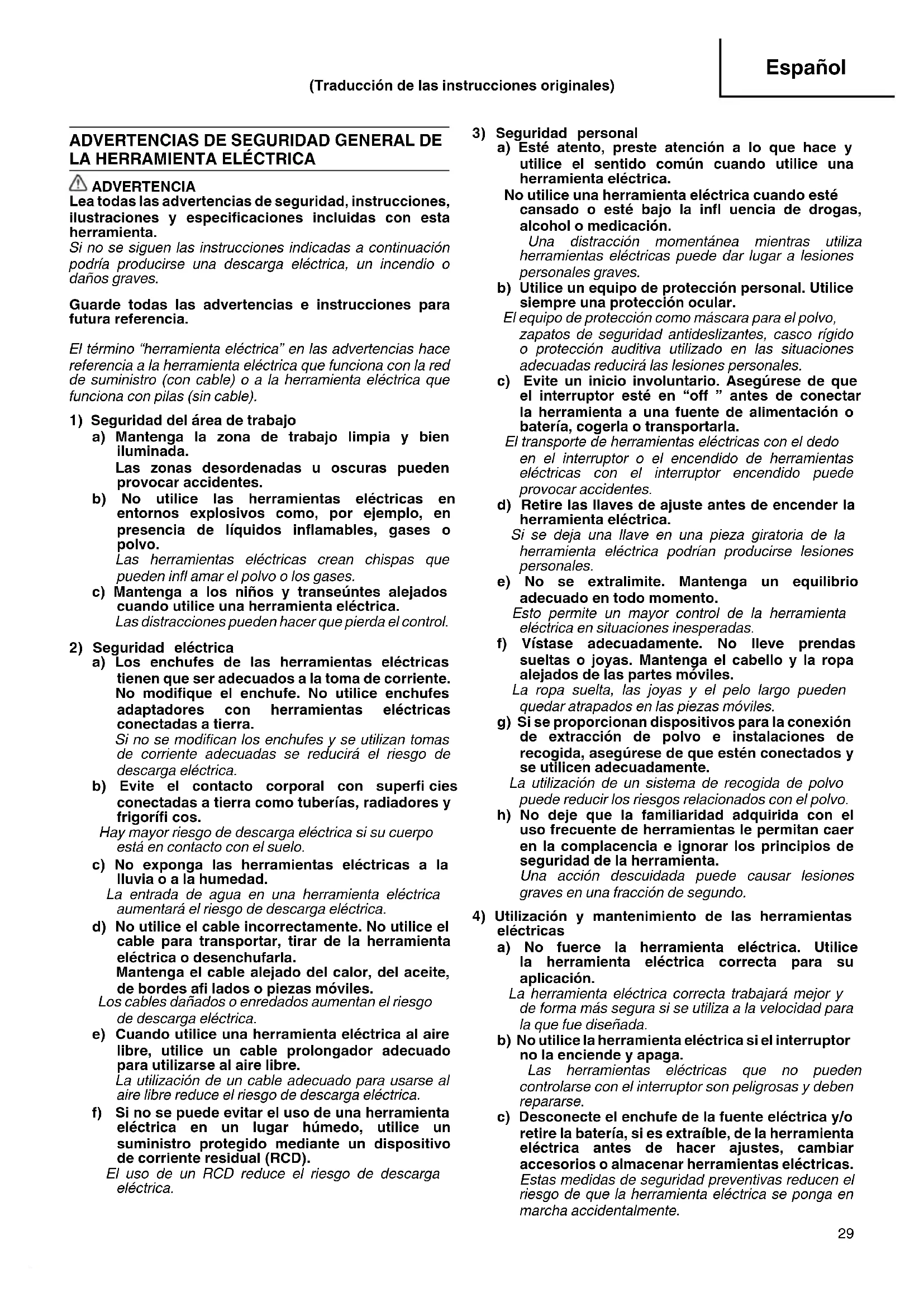 ADVERTENCIA Lea todas las advertencias de seguridad, instrucciones, ilustraciones y especifi caciones incluidas con esta herramienta. Si no se siguen las instrucciones indicadas a continuación podría producirse una descarga eléctrica, un incendio o daños graves. Guarde todas las advertencias e instrucciones para futura referencia. El término “herramienta eléctrica” en las advertencias hace referencia a la herramienta eléctrica que funciona con la red de suministro (con cable) o a la herramienta eléctrica que funciona con pilas (sin cable).