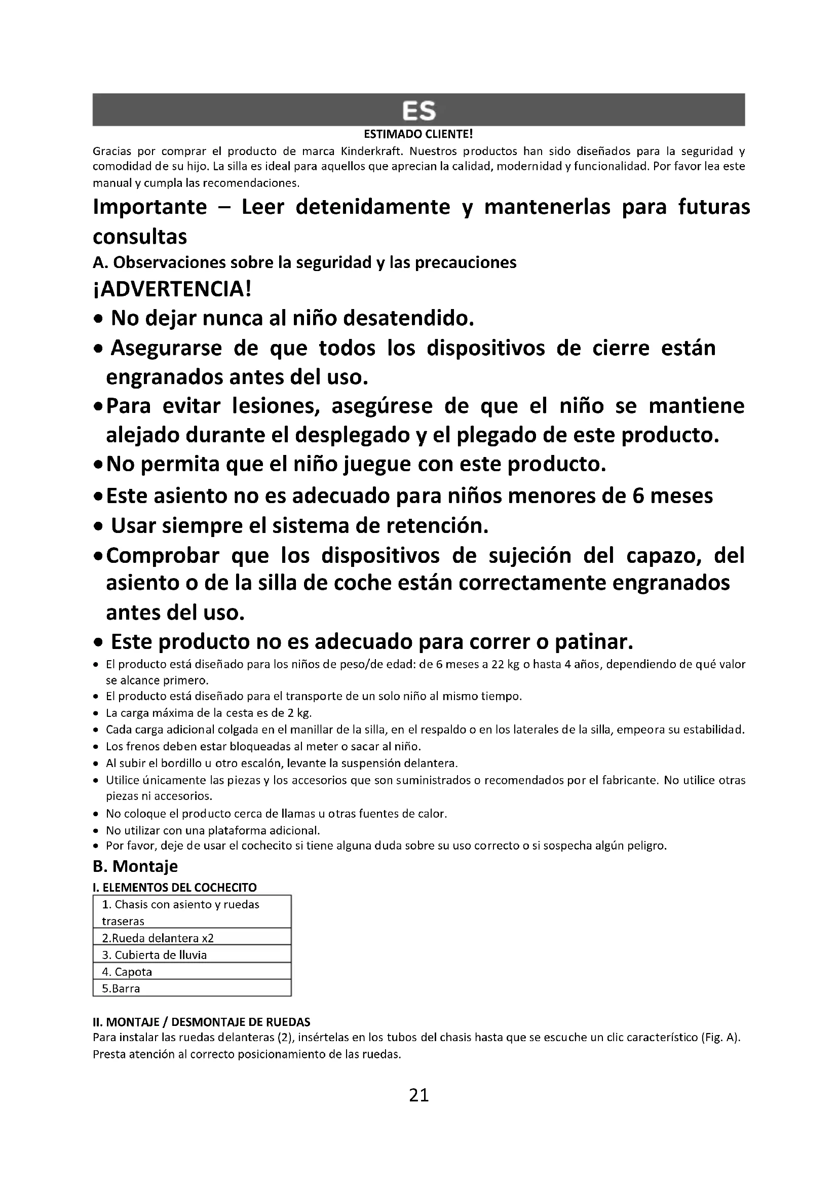- Por favor, deje de usar el cochecito si tiene alguna duda sobre su uso correcto o si sospecha algún peligro. B. Montaje