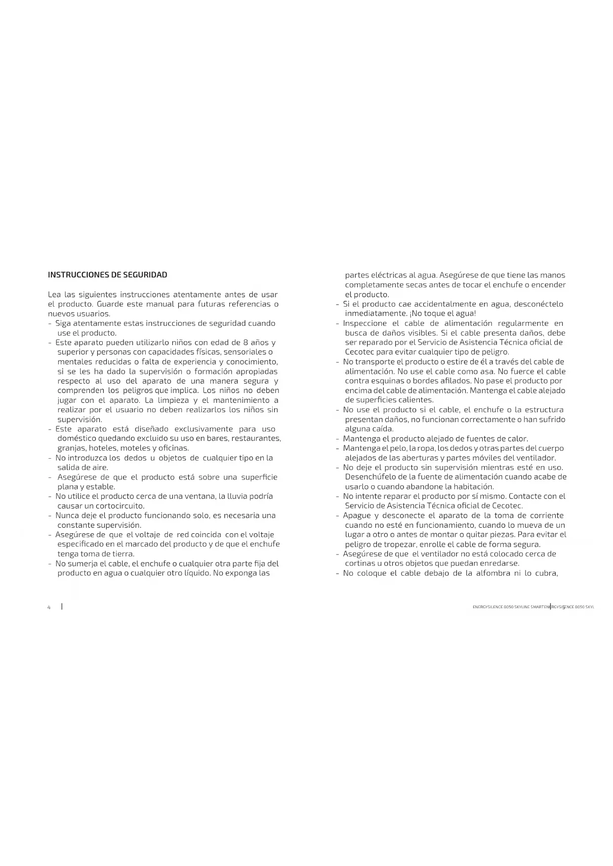 contacto con los ojos, láveselos de forma inmediata con abundante agua limpia por un mínimo de 10 minutos y busque asistencia médica. Utilice guantes para manejar la pila y deséchela inmediatamente de acuerdo con la normativa local. - Observe las marcas de positivo (+) y negativo (-) en las pilas y el mando y asegúrese de su correcta utilización. - No utilice ninguna pila que no esté diseñada para su uso con el equipo. - No mezcle pilas de diferente fabricación, capacidad, tamaño o tipo dentro del mando. - El uso de las pilas por parte de los niños debe ser supervisado. - Compre siempre las pilas recomendadas. - Mantenga las pilas limpias y secas. Limpie los terminales de las pilas con un paño limpio y seco si se ensucian. - Conserve la documentación original del producto para futuras consultas. - Utilice las pilas solo con el n para el que fueron concebidas. - Siempre que sea posible, retire las pilas cuando no esté en uso. SAFETY INSTRUCTIONS Read these instructions thoroughly before using the product. Keep this instruction manual for future reference or new users. - All safety instructions must be closely followed when using the appliance. - This appliance can be used by children aged 8 years and above and persons with reduced physical, sensory, or mental capabilities or lack of experience and knowledge if they have been given supervision or instruction concerning póngalo en un espacio libre de obstáculos y donde no se pueda tropezar con él. - Utilice el ventilador en un área grande. Cuando esté en funcionamiento, la distancia con respecto a la pared no debe ser inferior a 20 cm, para asegurar la correcta circulación del aire. Instrucciones sobre las pilas - La ingestión de pilas puede provocar quemaduras, perforación de partes blandas y la muerte. Pueden provocar quemaduras graves en las dos horas siguientes a la ingesta. - En caso de ingerir pilas acuda rápidamente a su centro médico más cercano. - No permita que los niños sustituyan pilas sin la supervisión de un adulto. - No desmonte, abra o destruya las pilas. - Mantenga las pilas fuera del alcance de los niños. Mantenga especialmente las pilas consideradas pequeñas fuera del alcance de los niños. En caso de ingestión de una pila, debe buscar rápidamente asistencia médica. - No exponga las pilas al calor o al fuego. Evite el almacenamiento a la luz directa del sol. - No cortocircuite un elemento o una pila. No almacene las pilas o baterías de forma desordenada en una caja o cajón donde puedan cortocircuitarse entre sí o ser cortocircuitadas por otros objetos metálicos. - No someta las pilas a golpes mecánicos. - Tanto las baterías como las pilas pueden presentar fugas en condiciones extremas. En caso de fuga de una célula, no permita que el líquido entre en contacto con la piel o los ojos. Si el líquido entra en contacto con la piel, lávese inmediatamente con agua y jabón. Si el líquido entra enENERGYSILENCE 8050 SKYLINE SMARTENERGYSILENCE 8050 SKYLINE SMART