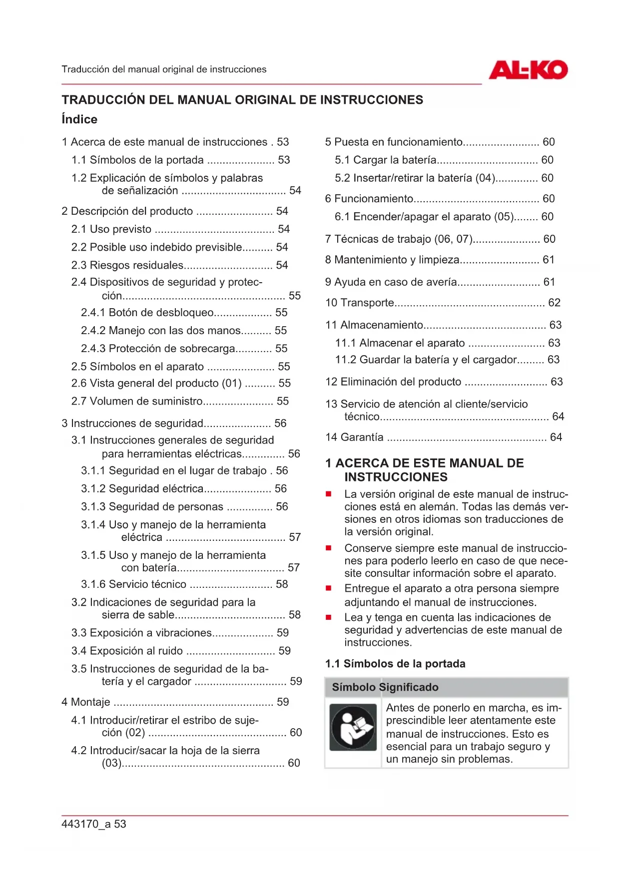 Símbolo Significado Antes de ponerlo en marcha, es im- prescindible leer atentamente este manual de instrucciones. Esto es esencial para un trabajo seguro y un manejo sin problemas.ES 54 PS 1815 Descripción del producto Símbolo Significado Manual de instrucciones