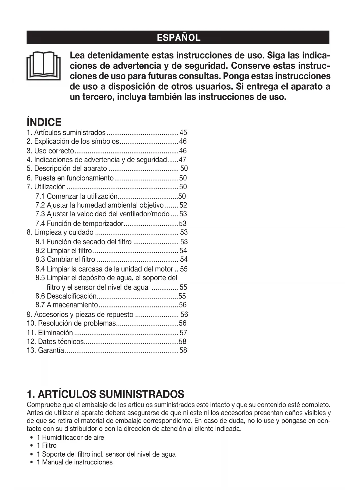 1. Artículos suministrados ...................................... 45