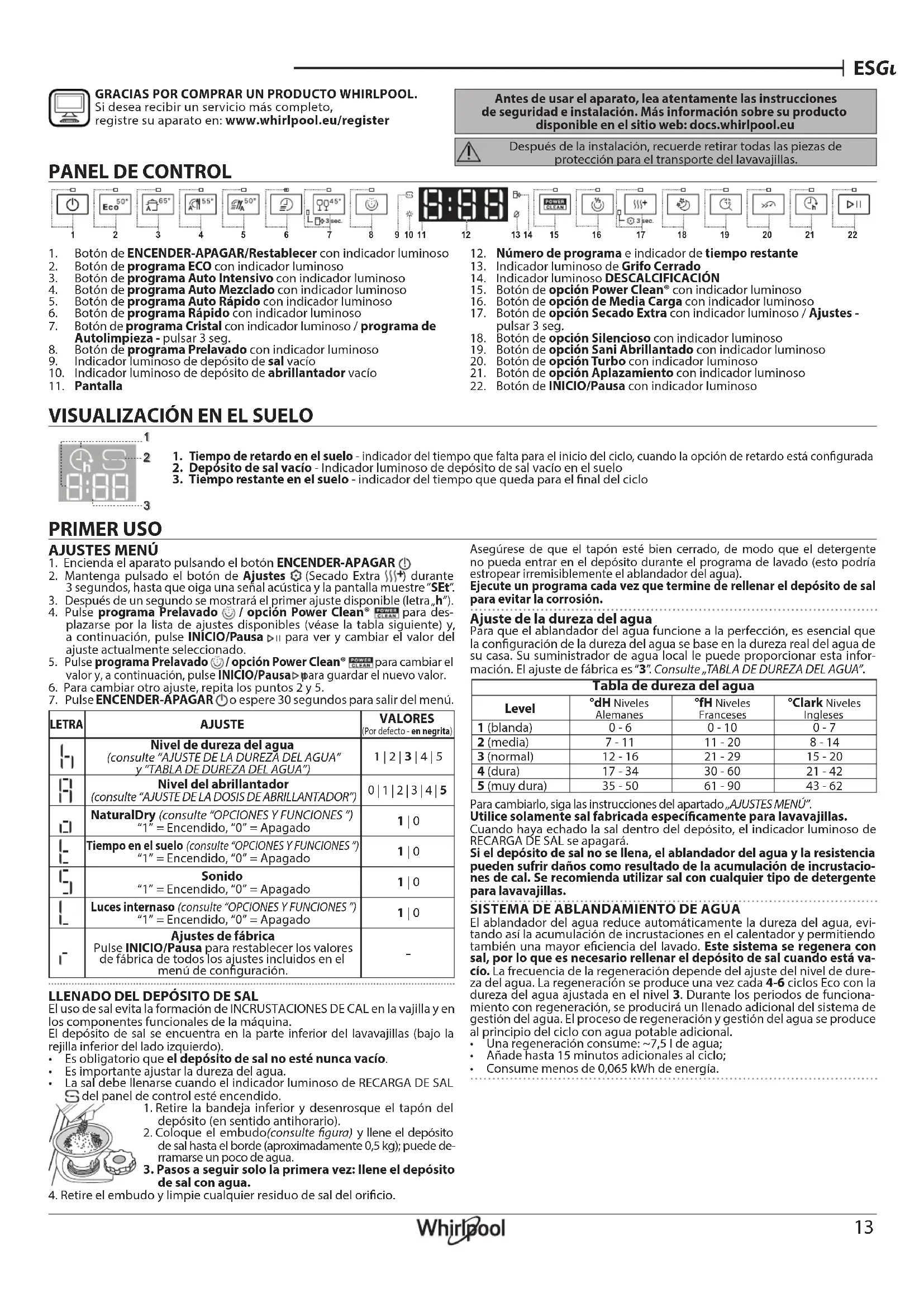 GRACIAS POR COMPRAR UN PRODUCTO WHIRLPOOL. Si desea recibir un servicio más completo, registre su aparato en: www.whirlpool.eu/register PRIMER USO Antes de usar el aparato, lea atentamente las instrucciones de seguridad e instalación. Más información sobre su producto disponible en el sitio web: docs.whirlpool.eu Después de la instalación, recuerde retirar todas las piezas de protección para el transporte del lavavajillas. AJUSTES MENÚ