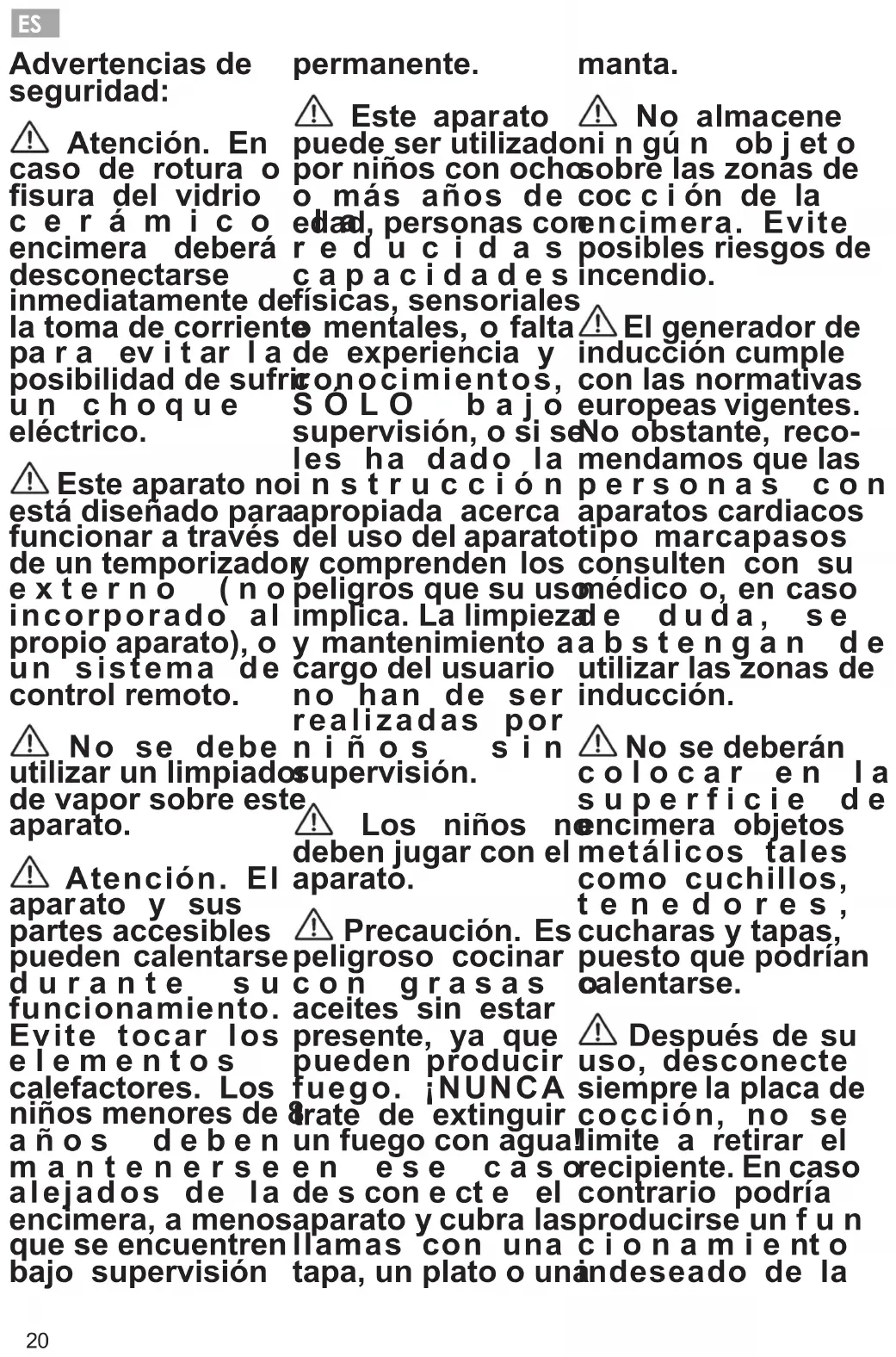 Advertencias de seguridad: Atención. En caso de rotura o fisura del vidrio F H U i P L F R O D HQFLPHUD GHEHUi desconectarse inmediatamente de la toma de corriente pa r a ev i t ar l a posibilidad de sufrir u n c h o q u e eléctrico. Este aparato no HVWiGLVHxDGRSDUD funcionar a través de un temporizador e x t e r n o ( n o incorporado al propio aparato), o un sistema de control remoto. No se debe utilizar un limpiador de vapor sobre este aparato. Atención. El aparato y sus partes accesibles pueden calentarse d u r a n t e s u funcionamiento. Evite tocar los e l e m e n t o s calefactores. Los QLxRVPHQRUHVGH D x R V G H E H Q m a n t e n e r s e alejados de la encimera, a menos que se encuentren bajo supervisión permanente. Este aparato puede ser utilizado SRUQLxRVFRQRFKR R PiV DxRV GH edad, personas con r e d u c i d a s c a p a c i d a d e s físicas, sensoriales o mentales, o falta de experiencia y conocimientos, S Ó L O b a j o supervisión, o si se les ha dado la i n s t r u c c i ó n apropiada acerca del uso del aparato y comprenden los peligros que su uso implica. La limpieza y mantenimiento a cargo del usuario no han de ser realizadas por Q L x R V V L Q supervisión. /RV QLxRV QR deben jugar con el aparato. Precaución. Es peligroso cocinar c o n g r a s a s o aceites sin estar presente, ya que pueden producir fuego. ¡NUNCA trate de extinguir un fuego con agua! e n e s e c a s o de s con e ct e el aparato y cubra las llamas con una tapa, un plato o una manta. No almacene ni n gú n ob j et o sobre las zonas de coc c i ón de la encimera. Evite posibles riesgos de incendio. El generador de inducción cumple con las normativas europeas vigentes. No obstante, reco- mendamos que las p e r s o n a s c o n aparatos cardiacos tipo marcapasos consulten con su médico o, en caso d e d u d a , s e a b s t e n g a n d e utilizar las zonas de inducción. 1RVHGHEHUiQ c o l o c a r e n l a s u p e r f i c i e d e encimera objetos PHWiOLFRV WDOHV como cuchillos, t e n e d o r e s , cucharas y tapas, puesto que podrían calentarse. Después de su uso, desconecte siempre la placa de cocción, no se limite a retirar el recipiente. En caso contrario podría producirse un f u n c i o n a m i e nt o indeseado de laES