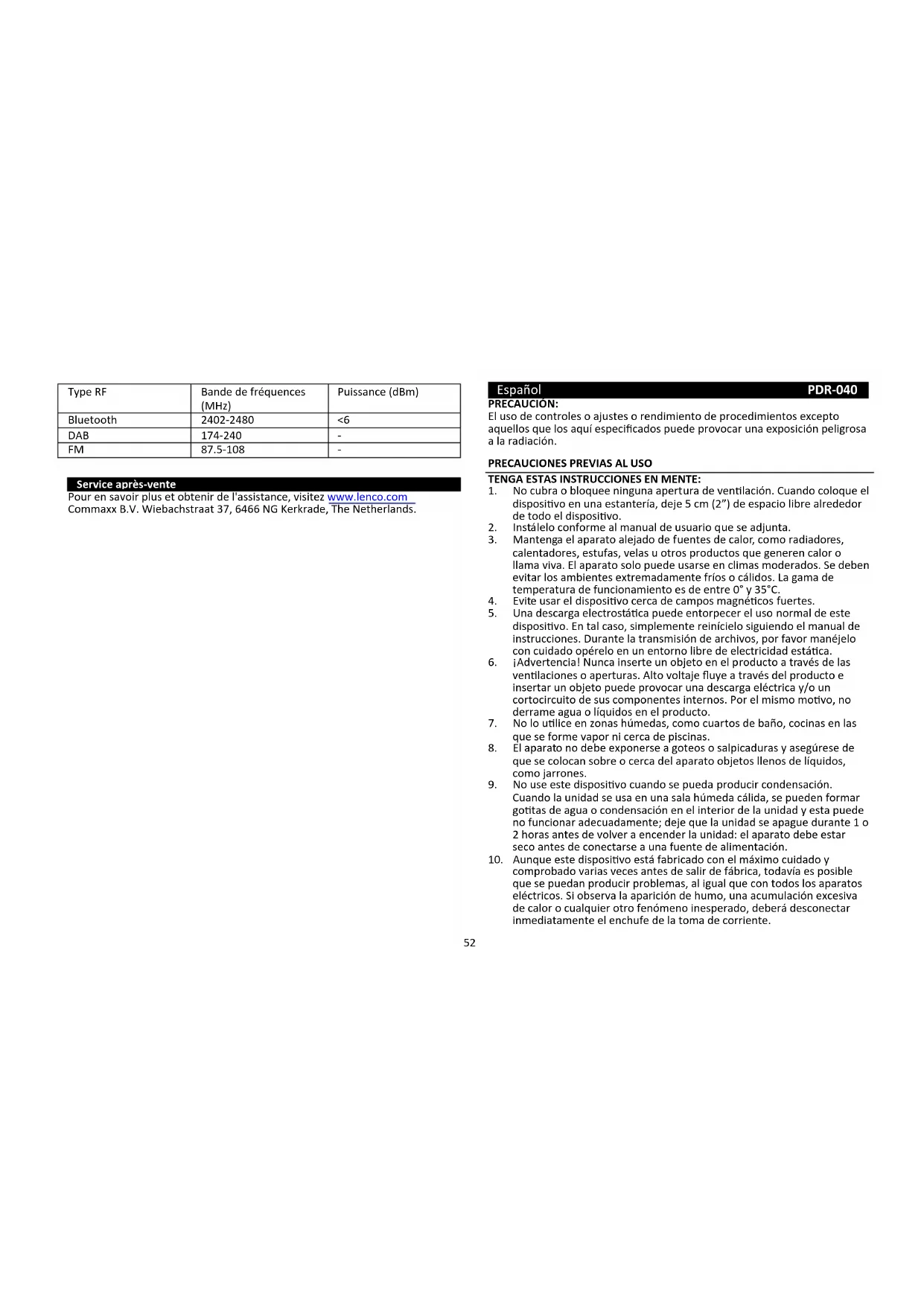 Por la presente, Commaxx declara que el tipo de equipo radioeléctrico [Lenco PDR-040] es conforme con la Directiva 2014/53/UE. El texto completo de la declaración UE de conformidad está disponible en la dirección Internet siguiente: https://commaxx-certificates.com/doc/pdr-040_doc.pdf Tipo de radiofrecuencia Rango de frecuencia (MHz) Potencia (dBm) Bluetooth 2402-2480