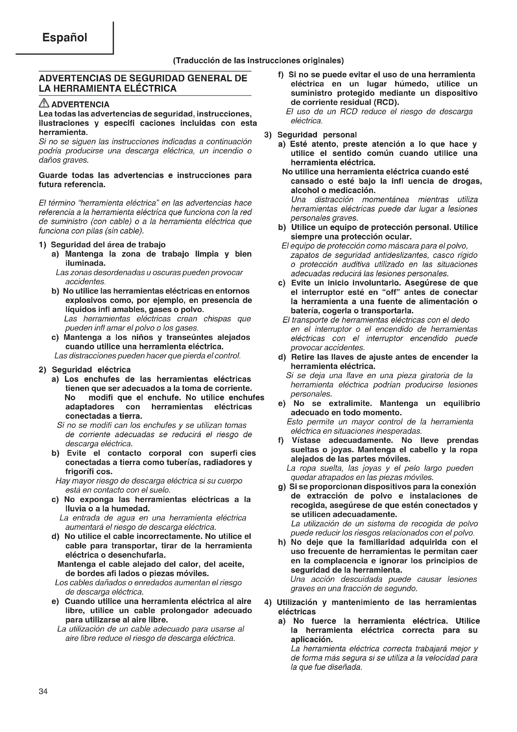 eléctricas a) No fuerce la herramienta eléctrica. Utilice la herramienta eléctrica correcta para su aplicación. La herramienta eléctrica correcta trabajará mejor y de forma más segura si se utiliza a la velocidad para la que fue diseñada. (Traducción de las instrucciones originales) 000BookW4YDEU.indb34000BookW4YDEU.indb34 2019/03/1414:09:062019/03/1414:09:06Español