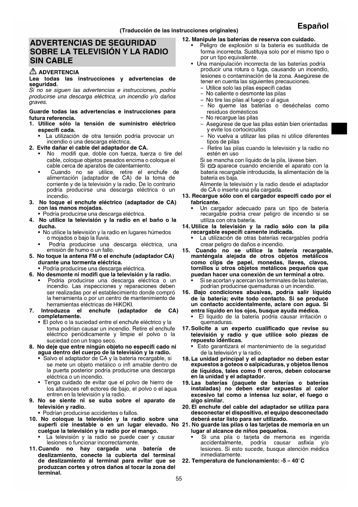 Siga las instrucciones que se indican en la siguiente tabla si la herramienta no funciona normalmente. Si esto no soluciona el problema, consulte a su distribuidor o al centro de servicio autorizado de HiKOKI. Síntoma Posible causa Solución No se conecta la alimentación El adaptador de CA está desconectado, o no está enchufado completamente en la toma de corriente. Conecte completamente el adaptador de CA en la toma de corriente. No hay carga restante en la batería Cargue la batería. No hay audio El volumen es demasiado bajo. Ajuste el volumen. La alimentación se apaga automáticamente La función de apagado automático está activada. Desactive la función de apagado automático. La fecha y/o la hora son incorrectas La pila de reserva está agotada. Cambie la pila de reserva por una nueva. La televisión no puede recibir señales Los canales no están confi gurados. Confi gurar los canales. Imposible confi gurar canales de TV El ajuste de país es incorrecto. Por favor verifi que el ajuste de país. Algunas señales de radiodifusión de televisión no se pueden recibir Las señales digitales terrestres no están siendo transmitidas. Pregunte a su emisora más cercana si están emitiendo señales digitales terrestres. Los subtítulos no se visualizan, o el Sonido de televisión multicanal no funciona El programa de televisión que está viendo no admite subtítulos y/o Sonido de televisión multicanal. Trate de usar los subtítulos o el Sonido de televisión multicanal en un programa de televisión que sea compatible. La imagen de la televisión se codifi ca o se para La antena está orientada en la dirección equivocada, o el cable de la antena está desconectado o roto. Asegúrese de que no hay problemas en la dirección en la cual está orientada la antena o con la conexión del cable de la antena. La televisión deja de mostrar imágenes poco después de encender la alimentación o cambiar de canal Esto no es un mal funcionamiento. Debido a que la señal se debe procesar para prepararla para que se muestre en la pantalla, cambiar el canal lleva varios segundos. Un dispositivo Bluetooth no puede conectarse, o su sonido se corta de forma intermitente El dispositivo no está emparejado. Empareje el dispositivo. Hay otro dispositivo cercano que emite señales de radio que estén interfi riendo como, por ejemplo, un enrutador inalámbrico. Trate de mover el dispositivo que causa interferencias en la recepción y de alejar la televisión y la radio una de otra. El dispositivo Bluetooth está muy lejos de la televisión y la radio. Trate de acercar el dispositivo a la televisión y la radio. El vídeo, la música o las fotos de un dispositivo externo no pueden ser visualizados o reproducidos, o las carpetas y los archivos del dispositivo no se pueden visualizar. La conexión no se reconoce correctamente. Pruebe a desconectar y volver a conectar el dispositivo externo. Si todavía no se reconoce, pruebe a desactivar la alimentación de la televisión y la radio y vuelva a encenderla. El mando a distancia no funciona El mando a distancia no está orientado hacia el sensor del mando a distancia. Apunte el mando a distancia hacia el sensor del mando a distancia de la televisión y la radio mientras lo opera. El mando a distancia está demasiado lejos del sensor del mando a distancia. Utilice el mando a distancia desde aprox. 3 m de distancia o más cerca. El sensor del mando a distancia de la televisión y la radio está bajo una iluminación intensa, como la luz solar directa. Coloque la televisión y la radio en una ubicación fuera del alcance de la luz directa del sol y de otras luces brillantes. Las pilas del mando a distancia están agotadas. Sustituya las pilas del mando a distancia por otras nuevas. 0000BookUR18DSML.indb640000BookUR18DSML.indb64 2019/07/0310:39:402019/07/0310:39:4065 Português (Tradução das instruções originais) AVISOS DE SEGURANÇA DA TV E