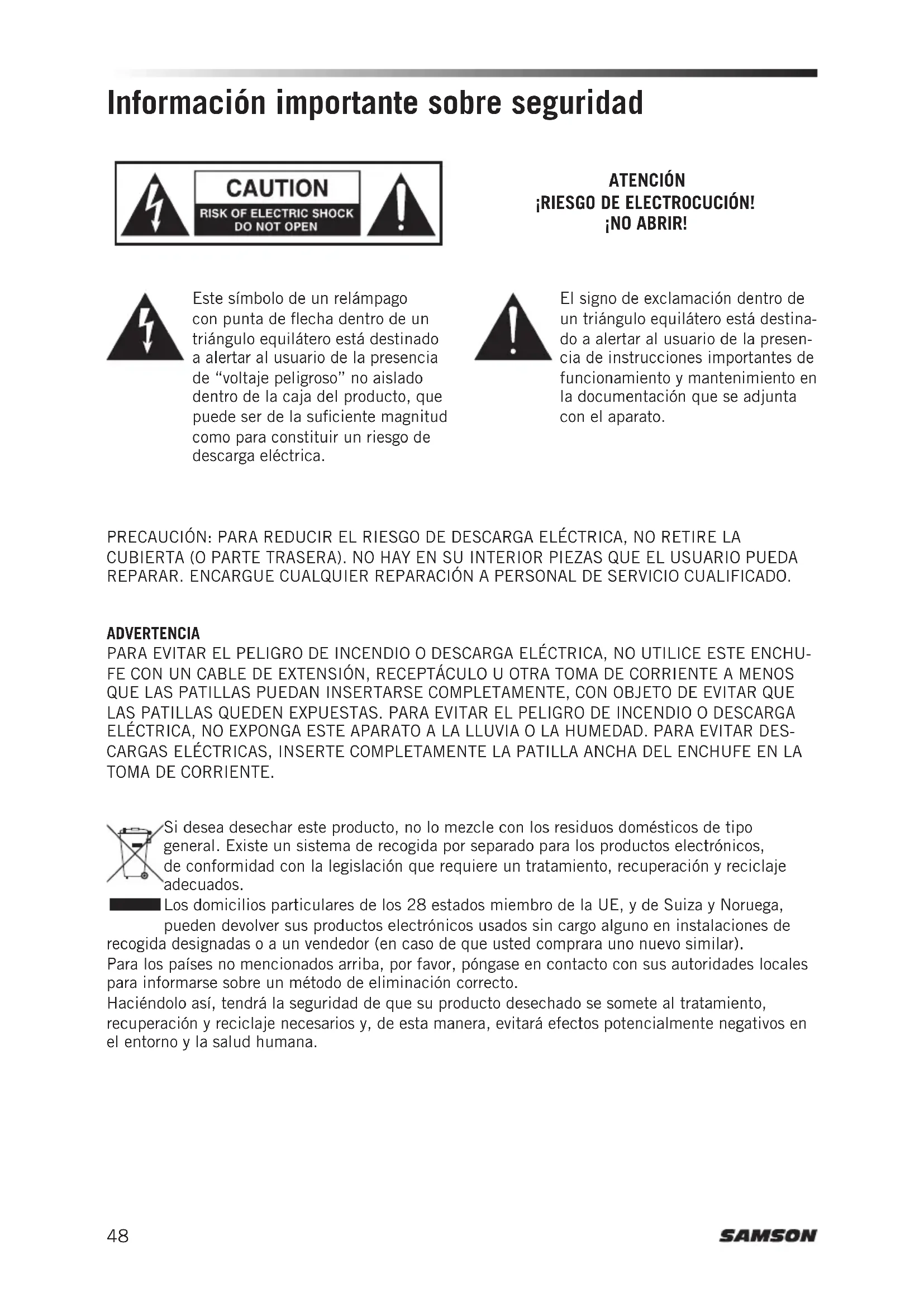 System Reichweite 100m (300') bei Sichtkontakt Audio-Frequenzbereich 50Hz–15kHz Klirrfaktor (gesamt) <1% (@Audio 1kHz, Funk 46dBu) Dynamikbereich >100dB A-gewichtet Signal-Rauschabstand >95dB Betriebstemperatur –10 bis +60°C Pilottonfrequenz 32,768kHz ATX-Mikrofonsender Eingangsbuchse Mini-XLR (P3) Eingangsimpedanz 3kΩ Bereich Eingangspegel 20dB Funkleistung 10mW EIRP Stromversorgung 3,6V 500mAh wiederaufladbare Lithium-Ionen-Batterie Batterielaufzeit 8Stunden Abmessungen (LxBxH) 150x170x100mm 5,9” x 6,7” x 3,9” Gewicht 60g (0,13lb) CR99-Empfänger Audio-Ausgangspegel – unsymmetrisch +14dBu Audio-Ausgangspegel – symmetrisch +9dBu Audio-Ausgangsimpedanz – unsymmetrisch 810Ohm Audio-Ausgangsimpedanz – symmetrisch 240Ohm Empfindlichkeit -100dBm / 30dB sinad Spiegelunterdrückung >50dB Betriebsspannung 15VDC, 200mA Abmessungen (LxBxH) 200x 150x 42mm 7,87” x 5,9” x 1,6” Gewicht 0,946kg (2,08lb) Bei Samson verbessern wir unsere Produkte kontinuierlich. Entsprechend behalten wir uns das Recht vor, Spezifikationen und Abbildungen ohne vorherige Ankündigung zu ändern. Technische Daten48 Información importante sobre seguridad PRECAUCIÓN: PARA REDUCIR EL RIESGO DE DESCARGA ELÉCTRICA, NO RETIRE LA CUBIERTA (O PARTE TRASERA). NO HAY EN SU INTERIOR PIEZAS QUE EL USUARIO PUEDA REPARAR. ENCARGUE CUALQUIER REPARACIÓN A PERSONAL DE SERVICIO CUALIFICADO. Este símbolo de un relámpago con punta de flecha dentro de un triángulo equilátero está destinado a alertar al usuario de la presencia de “voltaje peligroso” no aislado dentro de la caja del producto, que puede ser de la suficiente magnitud como para constituir un riesgo de descarga eléctrica. El signo de exclamación dentro de un triángulo equilátero está destina- do a alertar al usuario de la presen- cia de instrucciones importantes de funcionamiento y mantenimiento en la documentación que se adjunta con el aparato. ATENCIÓN ¡RIESGO DE ELECTROCUCIÓN! ¡NO ABRIR! ADVERTENCIA PARA EVITAR EL PELIGRO DE INCENDIO O DESCARGA ELÉCTRICA, NO UTILICE ESTE ENCHU- FE CON UN CABLE DE EXTENSIÓN, RECEPTÁCULO U OTRA TOMA DE CORRIENTE A MENOS QUE LAS PATILLAS PUEDAN INSERTARSE COMPLETAMENTE, CON OBJETO DE EVITAR QUE LAS PATILLAS QUEDEN EXPUESTAS. PARA EVITAR EL PELIGRO DE INCENDIO O DESCARGA ELÉCTRICA, NO EXPONGA ESTE APARATO A LA LLUVIA O LA HUMEDAD. PARA EVITAR DES- CARGAS ELÉCTRICAS, INSERTE COMPLETAMENTE LA PATILLA ANCHA DEL ENCHUFE EN LA TOMA DE CORRIENTE. Si desea desechar este producto, no lo mezcle con los residuos domésticos de tipo general. Existe un sistema de recogida por separado para los productos electrónicos, de conformidad con la legislación que requiere un tratamiento, recuperación y reciclaje adecuados. Los domicilios particulares de los 28 estados miembro de la UE, y de Suiza y Noruega, pueden devolver sus productos electrónicos usados sin cargo alguno en instalaciones de recogida designadas o a un vendedor (en caso de que usted comprara uno nuevo similar). Para los países no mencionados arriba, por favor, póngase en contacto con sus autoridades locales para informarse sobre un método de eliminación correcto. Haciéndolo así, tendrá la seguridad de que su producto desechado se somete al tratamiento, recuperación y reciclaje necesarios y, de esta manera, evitará efectos potencialmente negativos en el entorno y la salud humana.Sistema inalámbrico ATX AirLine 49