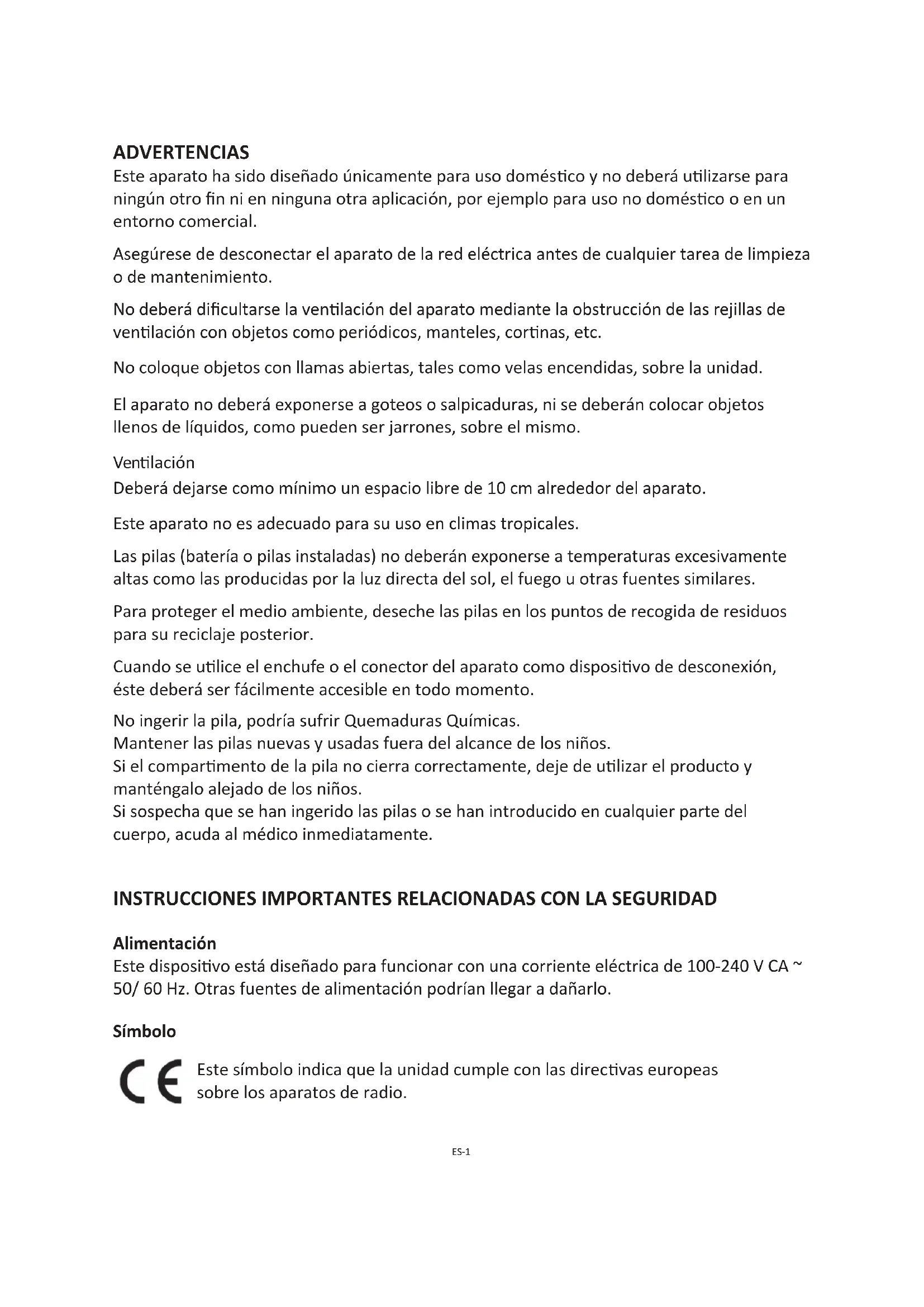 Este símbolo indica que la unidad cumple con las direcvas europeas sobre los aparatos de radio. No ingerir la pila, podría sufrir Quemaduras Químicas. Mantener las pilas nuevas y usadas fuera del alcance de los niños. Si el comparmento de la pila no cierra correctamente, deje de ulizar el producto y manténgalo alejado de los niños. Si sospecha que se han ingerido las pilas o se han introducido en cualquier parte del cuerpo, acuda al médico inmediatamente.ES-2 Manipulación y uso de las pilas Únicamente personas adultas podrán manipular las pilas. No permita que ningún niño u lice esta unidad sin haber cerrado bien la tapa del compar mento de las pilas.