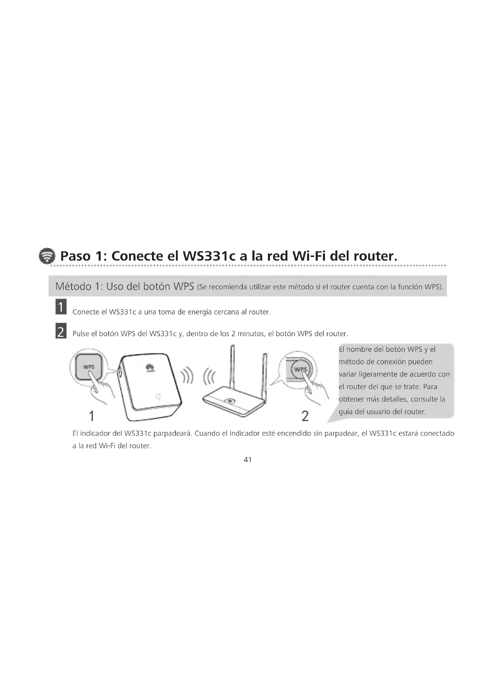 Paso 2: Coloque el WS331c en un lugar adecuado. La luz del indicador del WS331c cambiará de color de acuerdo con su ubicación. (Blanco sin parpadear: Ubicado en un lugar adecuado. Naranja sin parpadear: Demasiado cerca o demasiado lejos del router). Área de cobertura Wi-Fi del router El WS331c expande el área de cobertura Wi-Fi. Por defecto, el SSID y la clave WLAN de la red Wi-Fi expandida por el WS331c se sincronizan automáticamente con el SSID y la clave WLAN de la red Wi-Fi del router. Ahora, el WS331c ha expandido la red Wi-Fi del router.44 Preguntas frecuentes P: Después de utilizar el WS331c para expandir una red Wi-Fi, no puedo acceder a la página de gestión web del WS331c por medio de la dirección 192.168.33.1. ¿Qué hago? R: Utilice la dirección mediarouter.home. P: Después de utilizar el WS331c para expandir una red Wi-Fi, mi dispositivo no encuentra la red Wi-Fi del WS331c. ¿Qué hago? R: Por defecto, el SSID y la clave WLAN de la red Wi-Fi expandida por el WS331c se sincronizan automáticamente con el SSID y la clave WLAN de la red Wi-Fi del router. Busque la red Wi-Fi del router y conecte el dispositivo a esta. P: ¿Cómo se restablecen los ajustes predeterminados del WS331c? R: Con el WS331c encendido, mantenga pulsada la tecla Reset (Reiniciar) con el extremo de un sujetapapeles durante 2 segundos o más hasta que el indicador parpadee. ?45 Información de seguridad Interferencias con dispositivos médicos