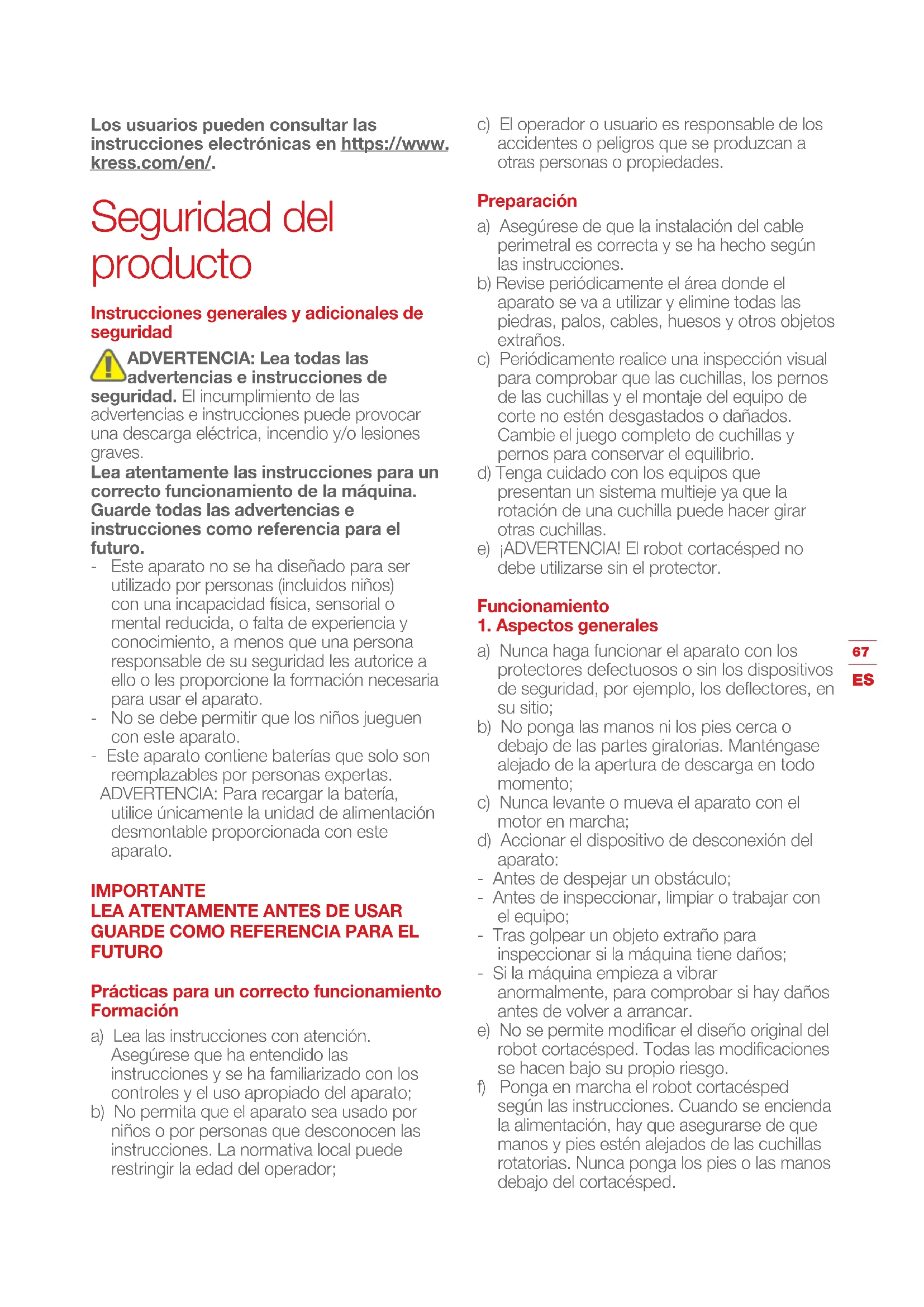 Los usuarios pueden consultar las instrucciones electrónicas en https://www. kress.com/en/. Seguridad del producto Instrucciones generales y adicionales de seguridad ADVERTENCIA: Lea todas las advertencias e instrucciones de seguridad. El incumplimiento de las advertencias e instrucciones puede provocar una descarga eléctrica, incendio y/o lesiones graves. Lea atentamente las instrucciones para un correcto funcionamiento de la máquina. Guarde todas las advertencias e instrucciones como referencia para el futuro. - Este aparato no se ha diseñado para ser utilizado por personas (incluidos niños) con una incapacidad física, sensorial o mental reducida, o falta de experiencia y conocimiento, a menos que una persona responsable de su seguridad les autorice a ello o les proporcione la formación necesaria para usar el aparato. - No se debe permitir que los niños jueguen con este aparato. - Este aparato contiene baterías que solo son reemplazables por personas expertas. ADVERTENCIA: Para recargar la batería, utilice únicamente la unidad de alimentación desmontable proporcionada con este aparato. IMPORTANTE