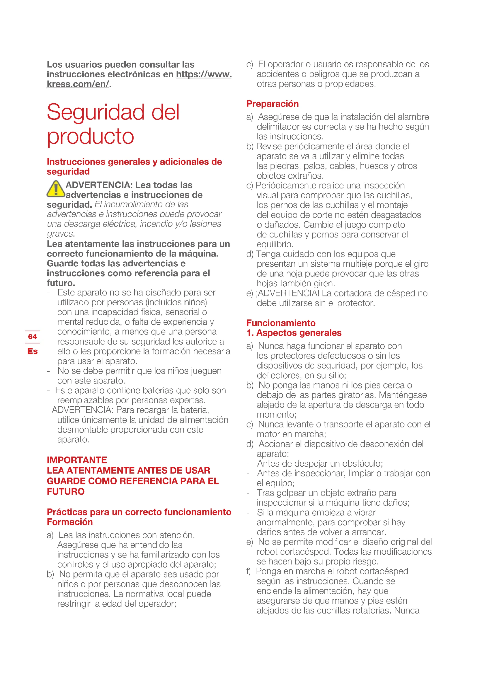 Los usuarios pueden consultar las instrucciones electrónicas en https://www. kress.com/en/. Seguridad del producto Instrucciones generales y adicionales de seguridad ADVERTENCIA: Lea todas las advertencias e instrucciones de seguridad. El incumplimiento de las advertencias e instrucciones puede provocar una descarga eléctrica, incendio y/o lesiones graves. Lea atentamente las instrucciones para un correcto funcionamiento de la máquina. Guarde todas las advertencias e instrucciones como referencia para el futuro. - Este aparato no se ha diseñado para ser utilizado por personas (incluidos niños) con una incapacidad física, sensorial o mental reducida, o falta de experiencia y conocimiento, a menos que una persona responsable de su seguridad les autorice a ello o les proporcione la formación necesaria para usar el aparato. - No se debe permitir que los niños jueguen con este aparato. - Este aparato contiene baterías que solo son reemplazables por personas expertas. ADVERTENCIA: Para recargar la batería, utilice únicamente la unidad de alimentación desmontable proporcionada con este aparato. IMPORTANTE