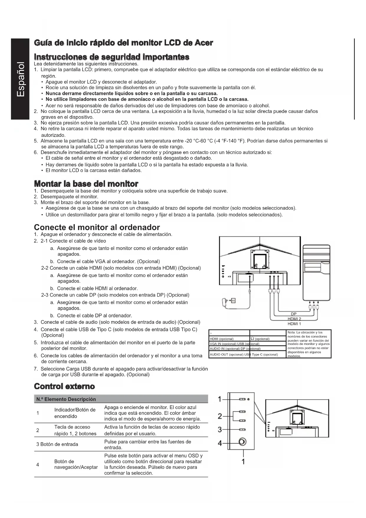 (típico) Contraste 100000000:1 Máx. (ACM) Ángulo de visión 178° (H) 178° (V) (CR=10) Tiempo de respuesta 1 ms (VRB) Tipo de panel VA Frecuencia horizontal Frecuencia vertical Colores de la pantalla Reloj de puntos Resolución máxima Conectar y listo VESA DDCCI/DDC2B Consumo de energía Modo Encendido 22 W (típico) Modo de suspensión 0,5 W (típico) Modo apagado 0,3 W (típico) Conector de entrada HDMI (solo modelos con entrada HDMI) (opcional) DP (solo el modelo de entrada DP) (opcional) Señal de vídeo de entrada HDMI (solo modelos con entrada HDMI) (opcional) DP (solo el modelo de entrada DP) (opcional) Altavoces 2 W x 2 (Solo modelos con entrada de audio) (opcional) Tamaño máximo de pantalla Horizontal: 544 mm Vertical: 303 mm Fuente de alimentación ENTRADA: 100-240 V, 50/60 Hz Condiciones medioambientales Temperatura de funcionamiento: 0° a 40°C Temperatura de almacenamiento: -20° a 60°C Humedad de funcionamiento: 20% a 80% Dimensiones Peso (neto) Especificaciones del mecanismo Inclinación: -5° a +25° Plataforma giratoria: +/-360° Ajuste de la altura: 120mm Giro: +/-90° Base de pie desmontable: Sí Controles externos Interruptor/Botones Botón de alimentación Acceso directo 1 Acceso directo 2 Entrada Menú/Navegación/Aceptar Funciones Brillo Contraste Luz azul baja Aumento de negro ACM HDR Supernitidez Gamma Temp. Color Modos Espacio de color Modo escala gris Matiz de 6 ejes Satur. 6 ejes Volumen Silencio Over Drive FreeSync Premium VRB Tasa de actual. Latencia ultrabaja Punto de mira Idioma T. de espera OSD Transparencia Bloqueo OSD Entrada Fuente automát. Modo panorámico Asignac. teclas rápidas DDC/CI Nivel negro HDMI Modo inicio ráp. Información Restablecer config. Las especificaciones varían en función del modelo o la región. Busque los manuales y otros documentos para el producto Acer en el sitio Web de soporte técnico de Acer oficial. 557,0 ((ancho) x 384,1-504,1 (alto) x 234,0 (diagonal) mm 4,45 Kg (neto) HDMI: 31,469-270,000KHz DP: 31,469-281,250KHz (Horas extras) DP: 1920x1080 a 250Hz 16,7 M de colores HDMI: 48-240Hz DP: 48-250Hz (Horas extras) HDMI: 594,000MHz DP: 618,750MHz (Horas extras) HDMI: 1920x1080 a 240HzFrançais Guide de démarrage rapide (GDR) – Moniteur LCD Acer Instructions importantes de sécurité Veuillez lire attentivement les instructions ci-dessous. 1. Nettoyage de l’écran LCD : assurez-vous d’abord que l’adaptateur d’alimentation que vous utilisez correspond aux normes électriques de votre région.