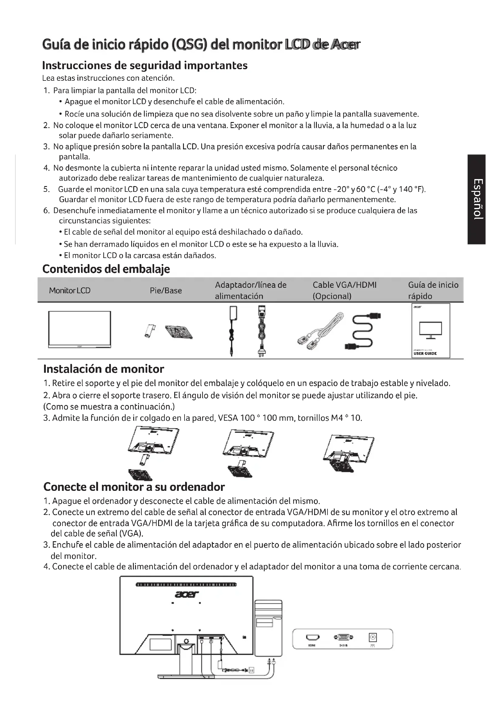 Conecte el monitor a su ordenador Contenidos del embalaje Monitor LCDAdaptador/línea de alimentaciónPie/BaseCable VGA/HDMI(Opcional)Guía de inicio rápido USER GUIDE Español Guía de inicio rápido (QSG) del monitor LCD de Acer Instrucciones de seguridad importantes Lea estas instrucciones con atención.1. Para limpiar la pantalla del monitor LCD: