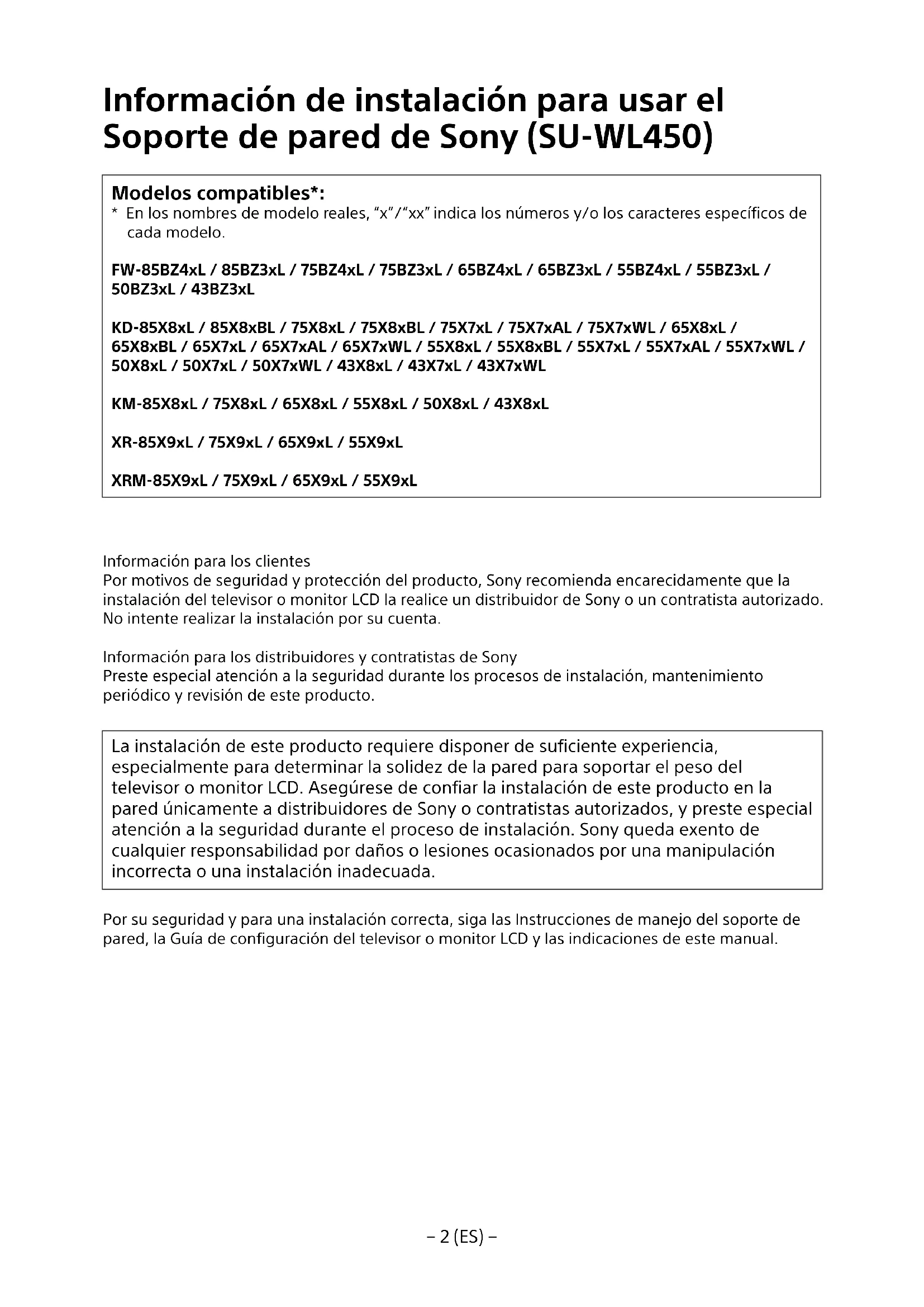 - En los nombres de modelo reales, “x”/“xx” indica los números y/o los caracteres específicos de cada modelo. FW-85BZ4xL / 85BZ3xL / 75BZ4xL / 75BZ3xL / 65BZ4xL / 65BZ3xL / 55BZ4xL / 55BZ3xL / 50BZ3xL / 43BZ3xL KD-85X8xL / 85X8xBL / 75X8xL / 75X8xBL / 75X7xL / 75X7xAL / 75X7xWL / 65X8xL / 65X8xBL/ 65X7xL / 65X7xAL / 65X7xWL / 55X8xL / 55X8xBL / 55X7xL / 55X7xAL / 55X7xWL / 50X8xL / 50X7xL / 50X7xWL / 43X8xL / 43X7xL / 43X7xWL KM-85X8xL / 75X8xL / 65X8xL / 55X8xL / 50X8xL / 43X8xL XR-85X9xL / 75X9xL / 65X9xL / 55X9xL XRM-85X9xL / 75X9xL / 65X9xL / 55X9xL Información para los clientes Por motivos de seguridad y protección del producto, Sony recomienda encarecidamente que la instalación del televisor o monitor LCD la realice un distribuidor de Sony o un contratista autorizado. No intente realizar la instalación por su cuenta. Información para los distribuidores y contratistas de Sony Preste especial atención a la seguridad durante los procesos de instalación, mantenimiento periódico y revisión de este producto. La instalación de este producto requiere disponer de suficiente experiencia, especialmente para determinar la solidez de la pared para soportar el peso del televisor o monitor LCD. Asegúrese de confiar la instalación de este producto en la pared únicamente a distribuidores de Sony o contratistas autorizados, y preste especial atención a la seguridad durante el proceso de instalación. Sony queda exento de cualquier responsabilidad por daños o lesiones ocasionados por una manipulación incorrecta o una instalación inadecuada. Por su seguridad y para una instalación correcta, siga las Instrucciones de manejo del soporte de pared, la Guía de configuración del televisor o monitor LCD y las indicaciones de este manual.− 3 (ES) −
