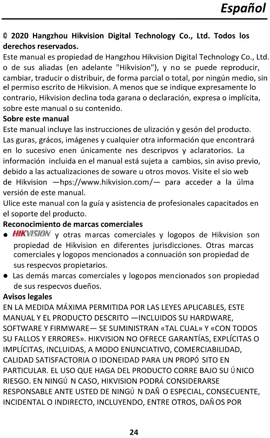 © 2020 Hangzhou Hikvision Digital Technology Co., Ltd. Todos los derechos reservados. Este manual es propiedad de Hangzhou Hikvision Digital Technology Co., Ltd. o de sus afiliadas (en adelante "Hikvision"), y no se puede reproducir, cambiar, traducir o distribuir, de forma parcial o total, por ningún medio, sin el permiso escrito de Hikvision. A menos que se indique expresamente lo contrario, Hikvision declina toda garantía o declaración, expresa o implícita, sobre este manual o su contenido. Sobre este manual Este manual incluye las instrucciones de utilización y gestión del producto. Las figuras, gráficos, imágenes y cualquier otra información que encontrará en lo sucesivo tienen únicamente fines descriptivos y aclaratorios. La información incluida en el manual está sujeta a cambios, sin aviso previo, debido a las actualizaciones de software u otros motivos. Visite el sitio web de Hikvision —https://www.hikvision.com/— para acceder a la última versión de este manual. Utilice este manual con la guía y asistencia de profesionales capacitados en el soporte del producto. Reconocimiento de marcas comerciales y otras marcas comerciales y logotipos de Hikvision son propiedad de Hikvision en diferentes jurisdicciones. Otras marcas comerciales y logotipos mencionados a continuación son propiedad de sus respectivos propietarios. Las demás marcas comerciales y logotipos mencionados son propiedad de sus respectivos dueños. Avisos legales EN LA MEDIDA MÁXIMA PERMITIDA POR LAS LEYES APLICABLES, ESTE MANUAL Y EL PRODUCTO DESCRITO —INCLUIDOS SU HARDWARE, SOFTWARE Y FIRMWARE— SE SUMINISTRAN «TAL CUAL» Y «CON TODOS SU FALLOS Y ERRORES». HIKVISION NO OFRECE GARANTÍAS, EXPLÍCITAS O IMPLÍCITAS, INCLUIDAS, A MODO ENUNCIATIVO, COMERCIABILIDAD, CALIDAD SATISFACTORIA O IDONEIDAD PARA UN PROPÓ SITO EN PARTICULAR. EL USO QUE HAGA DEL PRODUCTO CORRE BAJO SU ÚNICO RIESGO. EN NINGÚ N CASO, HIKVISION PODRÁ CONSIDERARSE RESPONSABLE ANTE USTED DE NINGÚ N DAÑ O ESPECIAL, CONSECUENTE, INCIDENTAL O INDIRECTO, INCLUYENDO, ENTRE OTROS, DAÑOS POREspañol