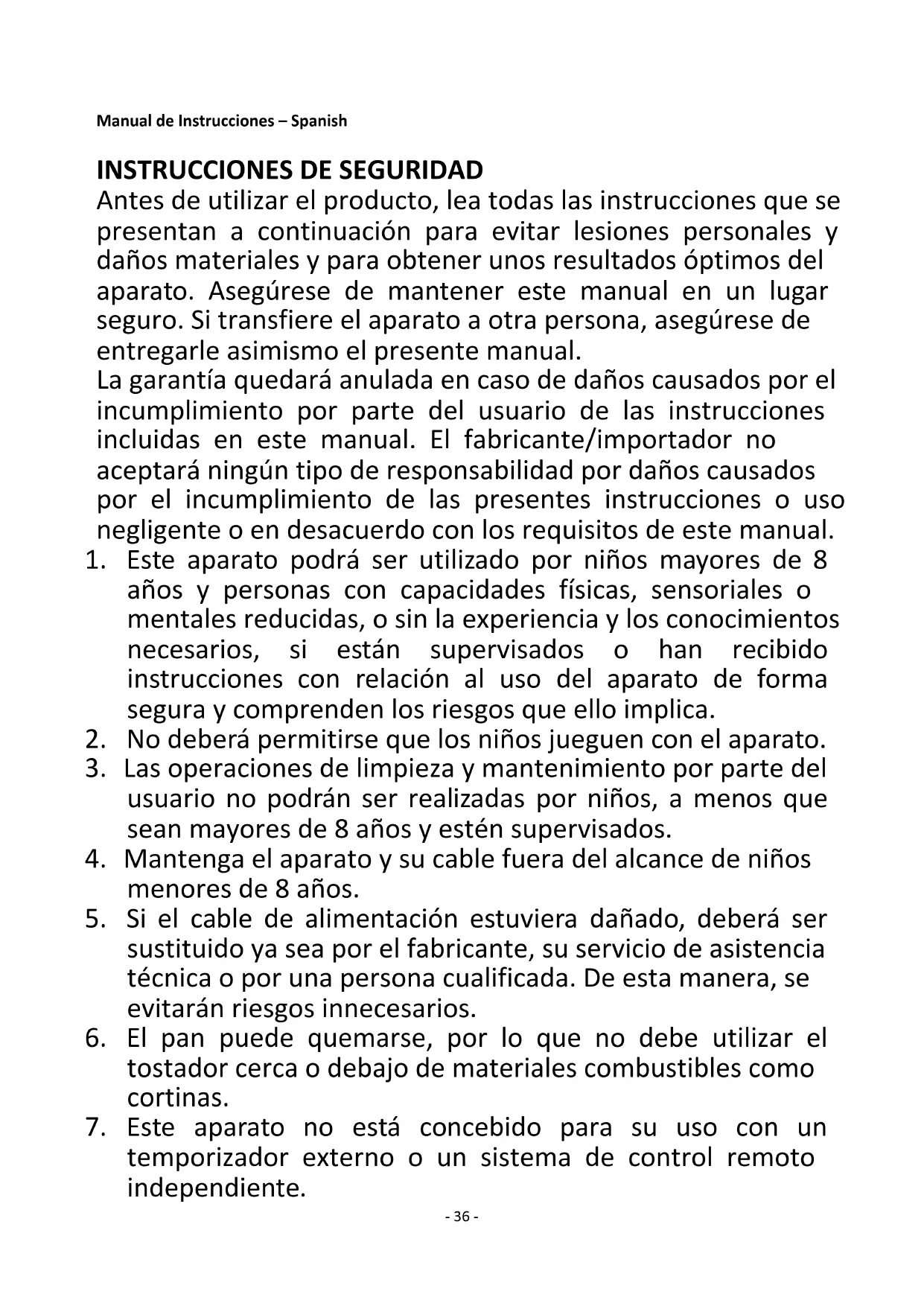 Antes de utilizar el producto, lea todas las instrucciones que se presentan a continuación para evitar lesiones personales y daños materiales y para obtener unos resultados óptimos del aparato. Asegúrese de mantener este manual en un lugar seguro. Si transfiere el aparato a otra persona, asegúrese de entregarle asimismo el presente manual. La garantía quedará anulada en caso de daños causados por el incumplimiento por parte del usuario de las instrucciones incluidas en este manual. El fabricante/importador no aceptará ningún tipo de responsabilidad por daños causados por el incumplimiento de las presentes instrucciones o uso negligente o en desacuerdo con los requisitos de este manual.