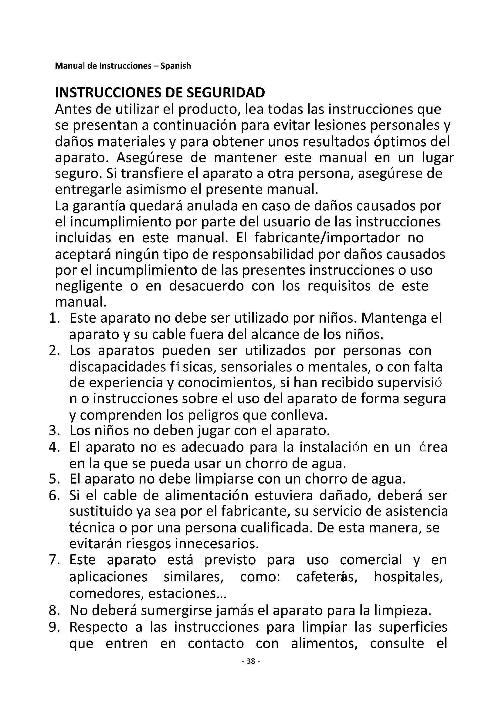 Antes de utilizar el producto, lea todas las instrucciones que se presentan a continuación para evitar lesiones personales y daños materiales y para obtener unos resultados óptimos del aparato. Asegúrese de mantener este manual en un lugar seguro. Si transfiere el aparato a otra persona, asegúrese de entregarle asimismo el presente manual. La garantía quedará anulada en caso de daños causados por el incumplimiento por parte del usuario de las instrucciones incluidas en este manual. El fabricante/importador no aceptará ningún tipo de responsabilidad por daños causados por el incumplimiento de las presentes instrucciones o uso negligente o en desacuerdo con los requisitos de este manual.