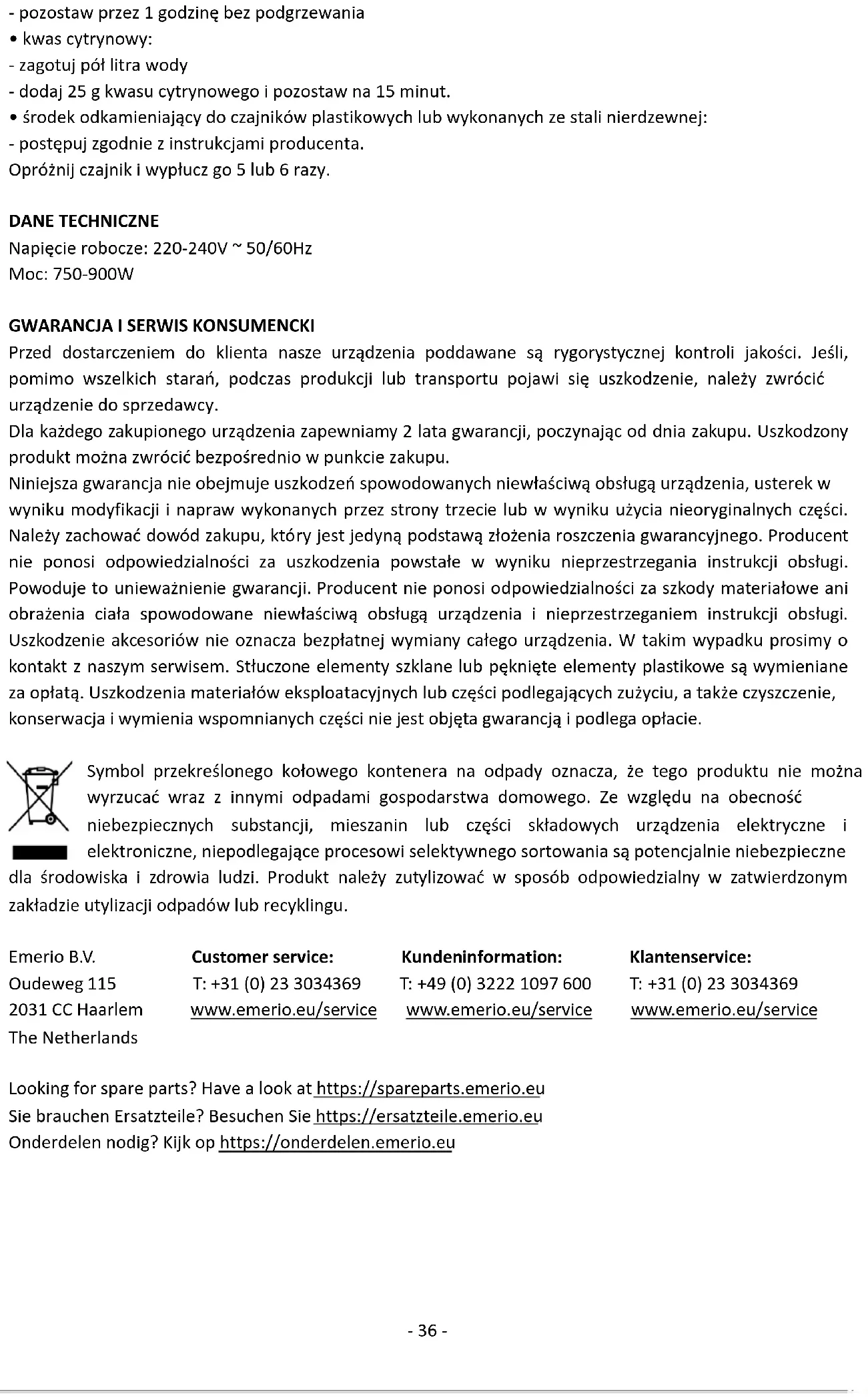 Antes del suministro, nuestros aparatos se someten a un rigurosos control de calidad. Si a pesar de todos los cuidados surgieran desperfectos durante la producción o el transporte, le rogamos devuelva el aparato a su vendedor. Para el aparato adquirido otorgamos 2 años de garantía partiendo de la fecha de venta. Todos los defectos producidos por el uso indebido del aparato, y las averías debidas a intervenciones y reparaciones por parte de terceros, o el montaje de piezas de repuestos no originales, no están cubiertos por esta garantía. Guarde siempre la factura, sin ella no pdrá reclamar ningún tipo de garantia. Nos no será responsable de daños materiales o lesiones personales causadeas de un mal uso del aparato o si las instrucciones de seguridad no han sido seguidas correctamente. Nos declina cualquier responsabilidad por daños derivados de no seguir las instrucciones de uso correctamente. Daños en el acceso teorías no significa libre de sustitución automática del aparato completo. En dichos, consulte el servicio al cliente. Los vidrios rotos o rotura de piezas de plástico están siempre sujetas a pago. Los defectos de los consumibles o piezas susceptibles a desgaste, así como la limpieza, mantenimiento o la sustitución de dichas piezas no están cubiertas por la garantía y por lo tanto, se deben pagar. El símbolo del contenedor de basura tachado significa que este producto no debe eliminarse con los residuos domésticos normales. Los aparatos electrónicos y eléctricos no incluidos en el proceso de clasificación selectiva son potencialmente peligrosos para el medio ambiente y la salud humana debido a la presencia de sustancias peligrosas. Por favor, deséchelos de forma responsable en una instalación de residuos o de reciclaje autorizada. Emerio B.V. Customer service: Kundeninformation: Klantenservice: Oudeweg 115 T: +31 (0) 23 3034369 T: +49 (0) 3222 1097 600 T: +31 (0) 23 3034369 2031 CC Haarlem www.emerio.eu/service www.emerio.eu/service www.emerio.eu/service The Netherlands Looking for spare parts? Have a look at https://spareparts.emerio.eu Sie brauchen Ersatzteile? Besuchen Sie https://ersatzteile.emerio.eu Onderdelen nodig? Kijk op https://onderdelen.emerio.eu