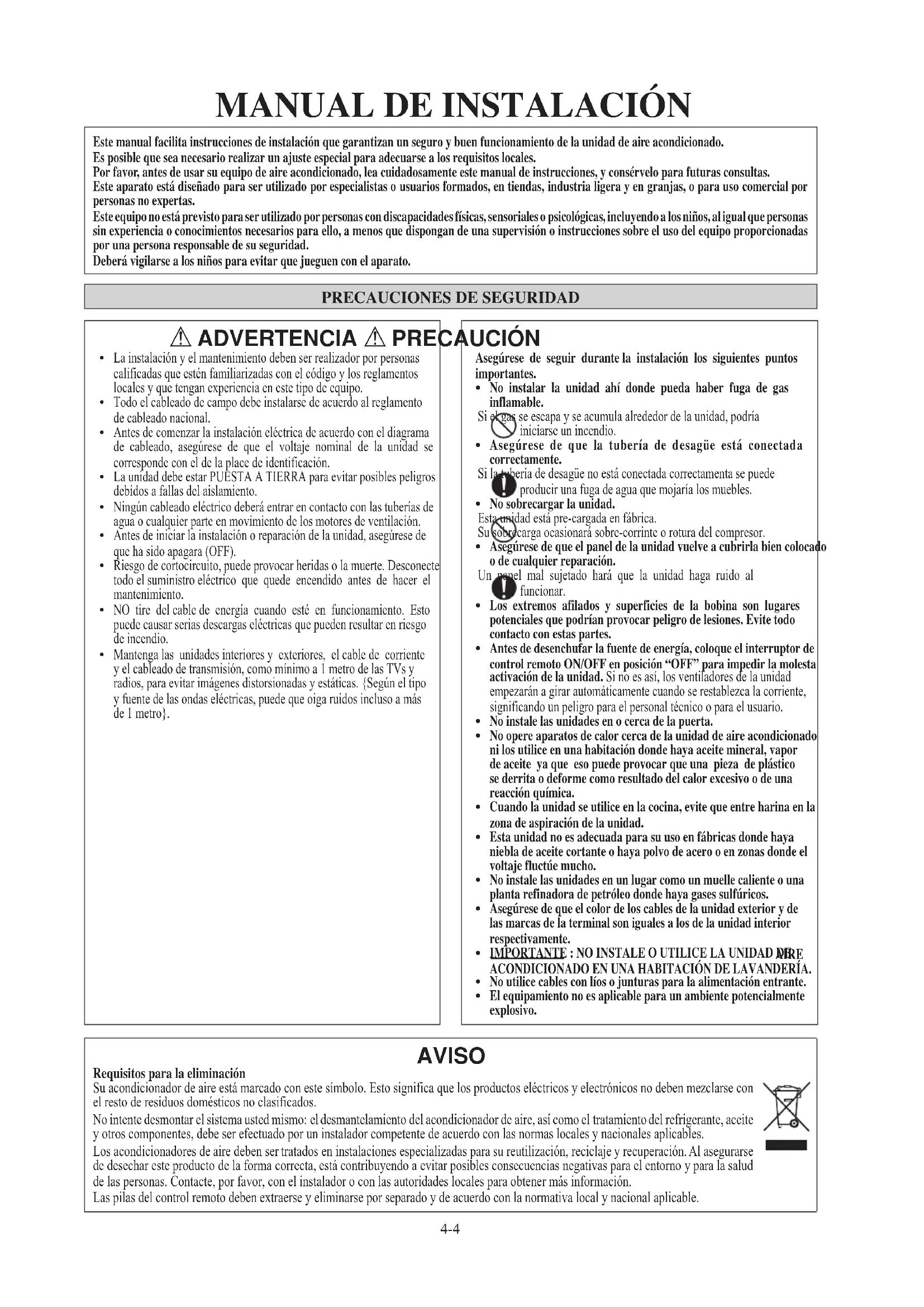 Asegúrese de seguir durante la instalación los siguientes puntos importantes. No instalar la unidad ahí donde pueda haber fuga de gas inflamable. Si el gas se escapa y se acumula alrededor de la unidad, podría iniciarse un incendio. Asegúrese de que la tubería de desagüe está conectada correctamente. Si la tubería de desagüe no está conectada correctamenta se puede producir una fuga de agua que mojaría los muebles. No sobrecargar la unidad. Esta unidad está pre-cargada en fábrica. Su sobrecarga ocasionará sobre-corrinte o rotura del compresor. Asegúrese de que el panel de la unidad vuelve a cubrirla bien colocado o de cualquier reparación. Un panel mal sujetado hará que la unidad haga ruido al funcionar. Los extremos afilados y superficies de la bobina son lugares potenciales que podrían provocar peligro de lesiones. Evite todo contacto con estas partes. Antes de desenchufar la fuente de energía, coloque el interruptor de control remoto ON/OFF en posición “OFF” para impedir la molesta activación de la unidad. Si no es así, los ventiladores de la unidad empezarán a girar automáticamente cuando se restablezca la corriente, significando un peligro para el personal técnico o para el usuario. No instale las unidades en o cerca de la puerta. No opere aparatos de calor cerca de la unidad de aire acondicionado ni los utilice en una habitación donde haya aceite mineral, vapor de aceite ya que eso puede provocar que una pieza de plástico se derrita o deforme como resultado del calor excesivo o de una reacción química. Cuando la unidad se utilice en la cocina, evite que entre harina en la zona de aspiración de la unidad. Esta unidad no es adecuada para su uso en fábricas donde haya niebla de aceite cortante o haya polvo de acero o en zonas donde el voltaje fluctúe mucho. No instale las unidades en un lugar como un muelle caliente o una planta refinadora de petróleo donde haya gases sulfúricos. Asegúrese de que el color de los cables de la unidad exterior y de las marcas de la terminal son iguales a los de la unidad interior respectivamente. IMPORTANTE : NO INSTALE O UTILICE LA UNIDAD DE AIRE ACONDICIONADO EN UNA HABITACIÓN DE LAVANDERÍA. No utilice cables con líos o junturas para la alimentación entrante. El equipamiento no es aplicable para un ambiente potencialmente explosivo.