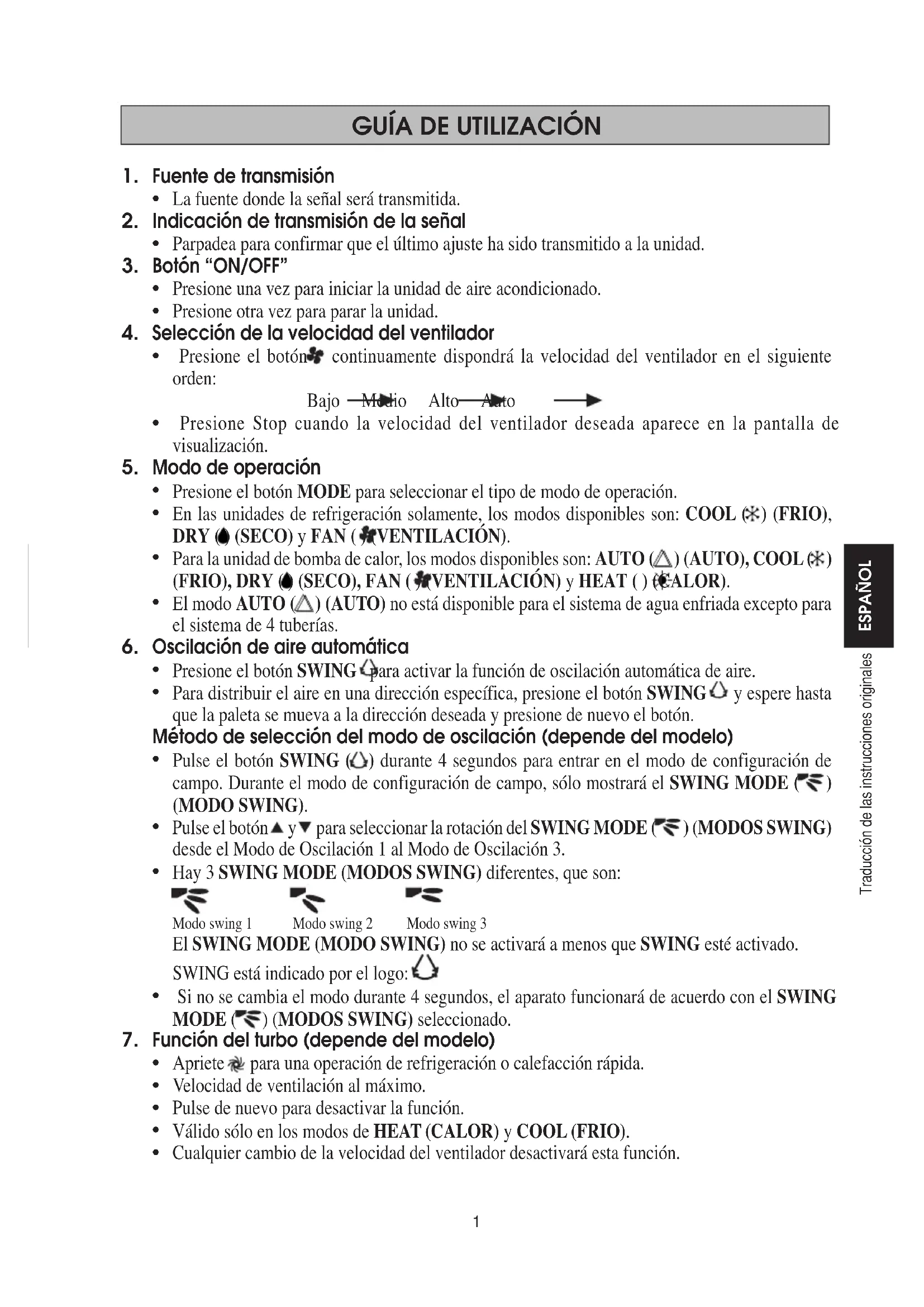 Fuente de transmisión La fuente donde la señal será transmitida. Indicación de transmisión de la señal Parpadea para confirmar que el último ajuste ha sido transmitido a la unidad. Botón “ON/OFF” Presione una vez para iniciar la unidad de aire acondicionado. Presione otra vez para parar la unidad. Selección de la velocidad del ventilador Presione el botón continuamente dispondrá la velocidad del ventilador en el siguiente orden: Bajo Medio Alto Auto Presione Stop cuando la velocidad del ventilador deseada aparece en la pantalla de visualización. Modo de operación Presione el botón MODE para seleccionar el tipo de modo de operación. En las unidades de refrigeración solamente, los modos disponibles son: COOL ( ) (FRIO), DRY ( ) (SECO) y FAN ( ) (VENTILACIÓN). Para la unidad de bomba de calor, los modos disponibles son: AUTO ( ) (AUTO), COOL ( ) (FRIO), DRY ( ) (SECO), FAN ( ) (VENTILACIÓN) y HEAT ( ) (CALOR). El modo AUTO ( ) (AUTO) no está disponible para el sistema de agua enfriada excepto para el sistema de 4 tuberías. Oscilación de aire automática Presione el botón SWING para activar la función de oscilación automática de aire. Para distribuir el aire en una dirección específica, presione el botón SWING y espere hasta que la paleta se mueva a la dirección deseada y presione de nuevo el botón. Método de selección del modo de oscilación (depende del modelo) Pulse el botón SWING ( ) durante 4 segundos para entrar en el modo de configuración de campo. Durante el modo de configuración de campo, sólo mostrará el SWING MODE ( ) (MODO SWING). Pulse el botón y para seleccionar la rotación del SWING MODE ( ) (MODOS SWING) desde el Modo de Oscilación 1 al Modo de Oscilación 3. Hay 3 SWING MODE (MODOS SWING) diferentes, que son: Modo swing 1 Modo swing 2 Modo swing 3 El SWING MODE (MODO SWING) no se activará a menos que SWING esté activado. SWING está indicado por el logo: Si no se cambia el modo durante 4 segundos, el aparato funcionará de acuerdo con el SWING MODE ( ) (MODOS SWING) seleccionado. Función del turbo (depende del modelo) Apriete para una operación de refrigeración o calefacción rápida. Velocidad de ventilación al máximo. Pulse de nuevo para desactivar la función. Válido sólo en los modos de HEAT (CALOR) y COOL (FRIO). Cualquier cambio de la velocidad del ventilador desactivará esta función.