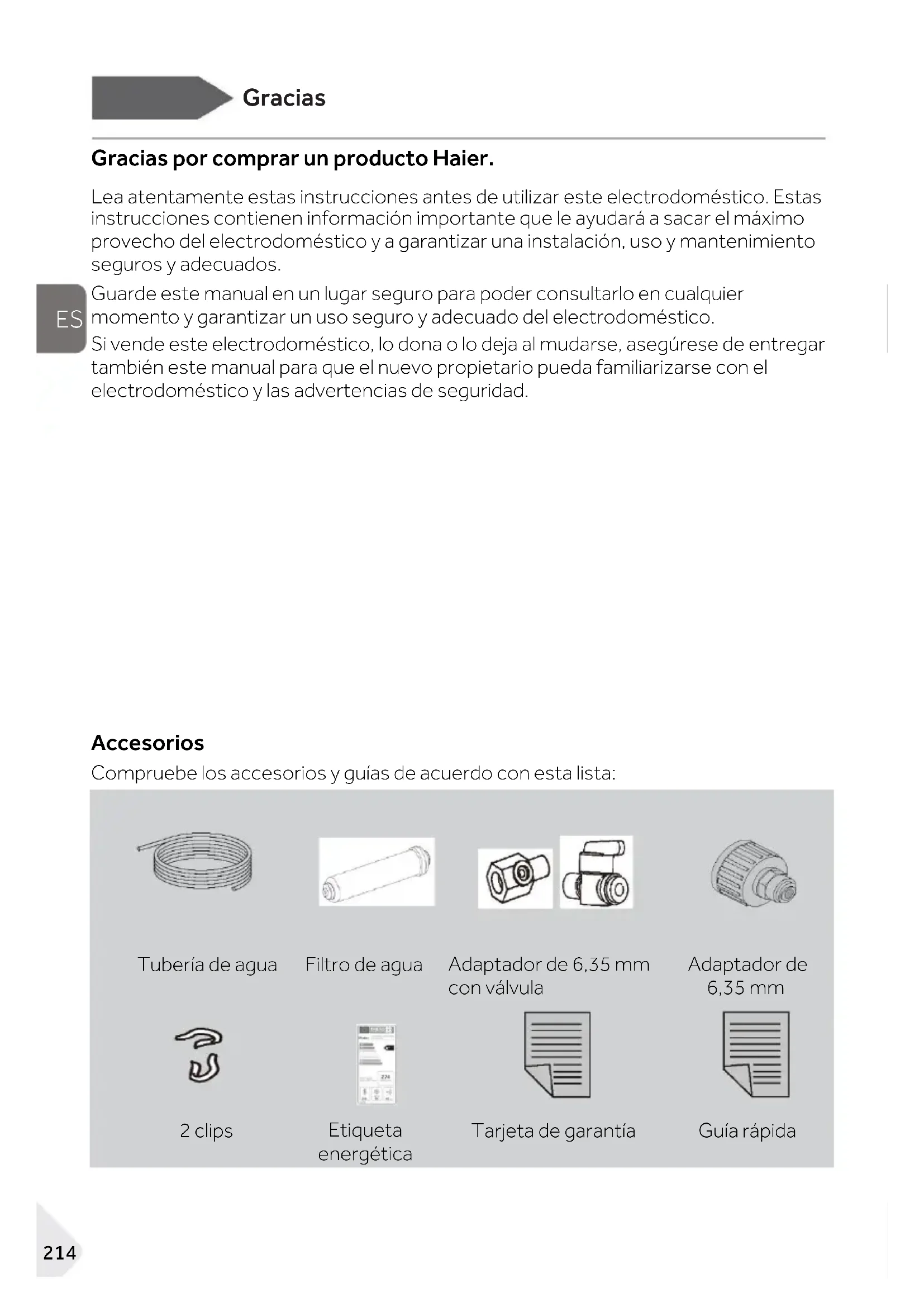 Gracias por comprar un producto Haier. Lea atentamente estas instrucciones antes de utilizar este electrodoméstico. Estas instrucciones contienen información importante que le ayudará a sacar el máximo provecho del electrodoméstico y a garantizar una instalación, uso y mantenimiento seguros y adecuados. Guarde este manual en un lugar seguro para poder consultarlo en cualquier momento y garantizar un uso seguro y adecuado del electrodoméstico. Si vende este electrodoméstico, lo dona o lo deja al mudarse, asegúrese de entregar también este manual para que el nuevo propietario pueda familiarizarse con el electrodoméstico y las advertencias de seguridad. Accesorios Compruebe los accesorios y guías de acuerdo con esta lista: