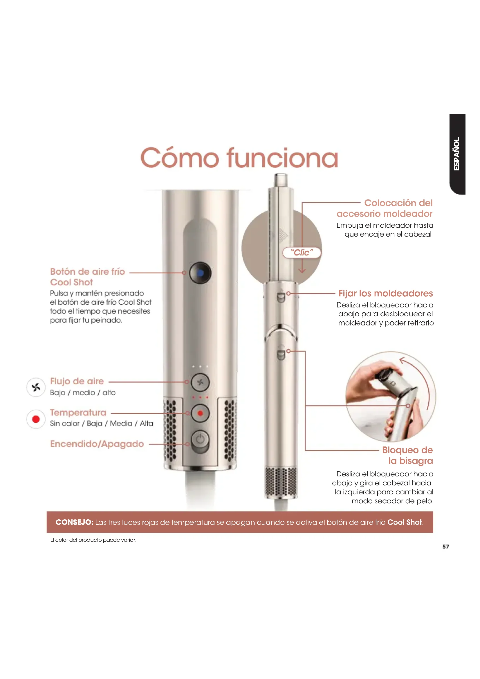 - -67 Difusor definidor de rizos** -69 *El concentrador y el difusor definidor de rizos no se incluyen con el HD420EU/HD420SLEU Para obtener accesorios y recambios visita sharkclean.eu57 Cómo funciona Flujo de aire Bajo / medio / alto Botón de aire frío Cool Shot Pulsa y mantén presionado el botón de aire frío Cool Shot todo el tiempo que necesites para fijar tu peinado. Temperatura Sin calor / Baja / Media / Alta Encendido/Apagado Fijar los moldeadores Desliza el bloqueador hacia abajo para desbloquear el moldeador y poder retirarlo Colocación del accesorio moldeador Empuja el moldeador hasta que encaje en el cabezal “Clic” Bloqueo de la bisagra Desliza el bloqueador hacia abajo y gira el cabezal hacia la izquierda para cambiar al modo secador de pelo. CONSEJO: Las tresluces rojas de temperatura se apagan cuando se activa el botón de aire frío Cool Shot. El color del producto puede variar. ESPAÑOL58 Pasa de moldeador a secador. Gira para cambiar de modo El concentrador 2 en 1 y el difusor definidor de rizos no se incluyen con el HD420EU/HD420SLEU Acopla en modo tubo Acopla en modo secador Modo tubo de peinado p. 68