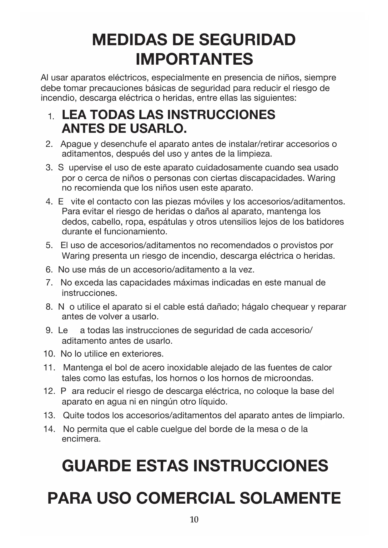 Commercial contra todo defecto de materiales o fabricación durante un año a partir de la fecha de compra, siempre que haya sido usada con alimentos, líquidos no abrasivos (a excepción de detergentes) y semilíquidos no abrasivos, y que no haya sido sujeta a cargas que excedan su máxima capacidad. Bajo esta garantía, Waring reparará o reemplazará toda pieza que, tras estar inspeccionada por nuestro servicio posventa, demuestre defectos de fabricación o fallas de materiales, siempre que el producto se regrese a un centro de servicio autorizado o se entregue con franqueo pagado a: 314 Ella T. Grasso Ave., Torrington, CT 06790. Esta garantía: a) no se aplica a ningún producto desgastado, defectuoso, dañado o roto debido a uso, reparaciones/ servicio realizados por personas no autorizadas, o abuso, mal uso, sobrecarga eléctrica o daños intencionales; b) no cubre daños incidentales o consecuentes de ningún tipo. Advertencia: utilizar este aparato con corriente continua (C.C./DC) invalidará la garantía. WARING COMMERCIAL 314 Ella T. Grasso Ave. Torrington, CT 0679018 IMPORTANTES CONSIGNES