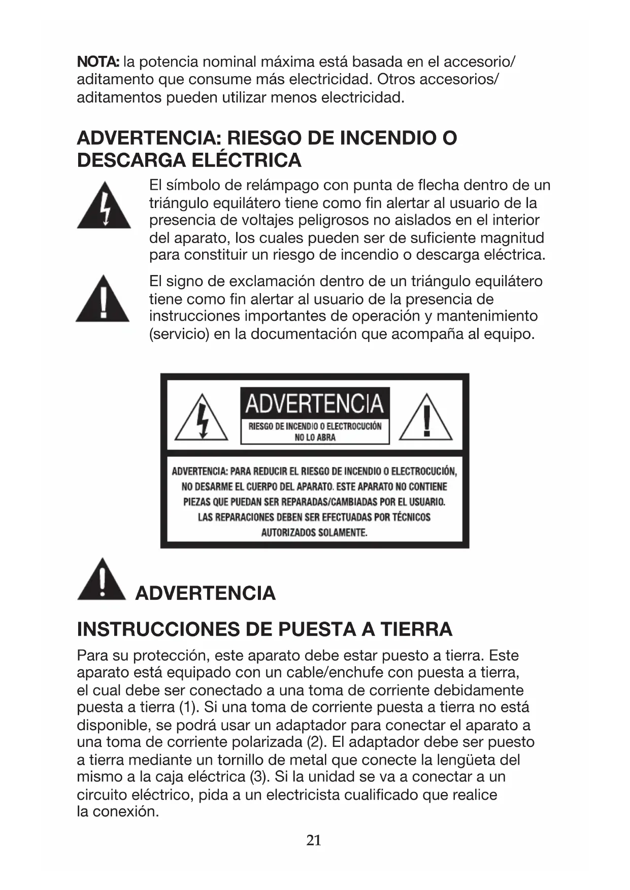Para su protección, este aparato debe estar puesto a tierra. Este aparato está equipado con un cable/enchufe con puesta a tierra, el cual debe ser conectado a una toma de corriente debidamente puesta a tierra (1). Si una toma de corriente puesta a tierra no está disponible, se podrá usar un adaptador para conectar el aparato a una toma de corriente polarizada (2). El adaptador debe ser puesto a tierra mediante un tornillo de metal que conecte la lengüeta del mismo a la caja eléctrica (3). Si la unidad se va a conectar a un circuito eléctrico, pida a un electricista cualificado que realice la conexión.22