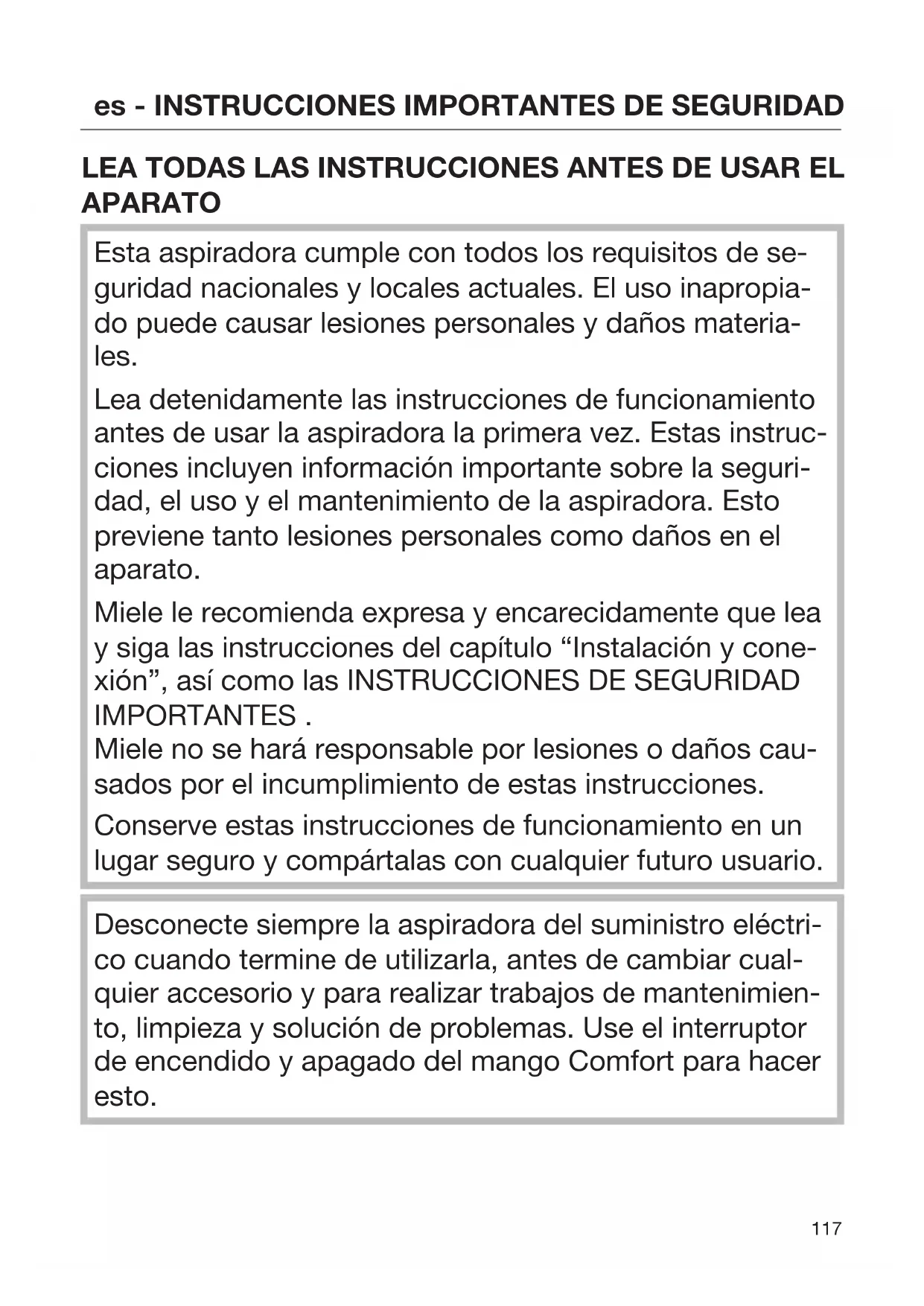 LEA TODAS LAS INSTRUCCIONES ANTES DE USAR EL APARATO Esta aspiradora cumple con todos los requisitos de se- guridad nacionales y locales actuales. El uso inapropia- do puede causar lesiones personales y daños materia- les. Lea detenidamente las instrucciones de funcionamiento antes de usar la aspiradora la primera vez. Estas instruc- ciones incluyen información importante sobre la seguri- dad, el uso y el mantenimiento de la aspiradora. Esto previene tanto lesiones personales como daños en el aparato. Miele le recomienda expresa y encarecidamente que lea y siga las instrucciones del capítulo “Instalación y cone- xión”, así como las INSTRUCCIONES DE SEGURIDAD IMPORTANTES . Miele no se hará responsable por lesiones o daños cau- sados por el incumplimiento de estas instrucciones. Conserve estas instrucciones de funcionamiento en un lugar seguro y compártalas con cualquier futuro usuario. Desconecte siempre la aspiradora del suministro eléctri- co cuando termine de utilizarla, antes de cambiar cual- quier accesorio y para realizar trabajos de mantenimien- to, limpieza y solución de problemas. Use el interruptor de encendido y apagado del mango Comfort para hacer esto.es - INSTRUCCIONES IMPORTANTES DE SEGURIDAD