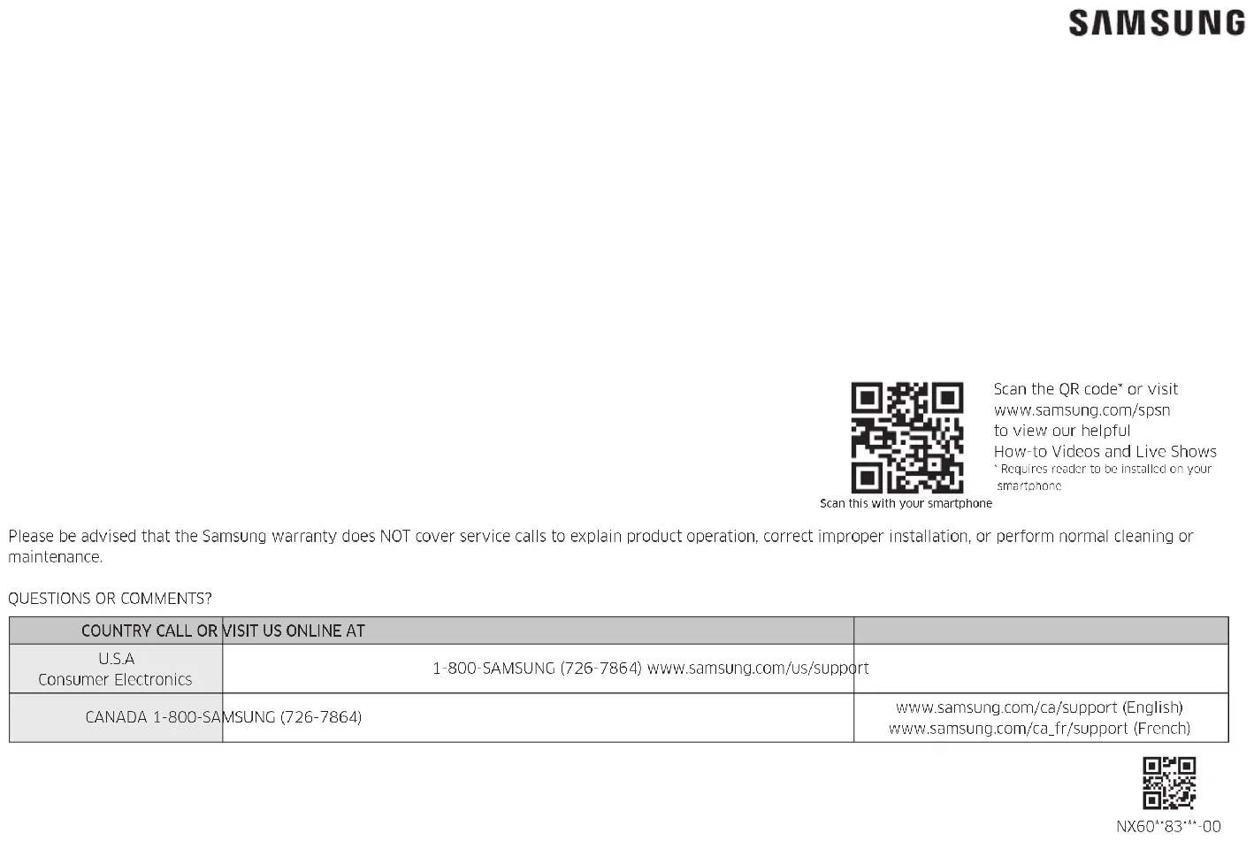 - Requires reader to be installed on your smartphone Scan this with your smartphone NX60**83***-00Estufa deslizable de gas Manual del usuario NX60**83****2 Español ADVERTENCIA: Si no se sigue la información de este manual con exactitud, podrían producirse incendios o explosiones que causen daños a la propiedad, lesiones personales o la muerte.