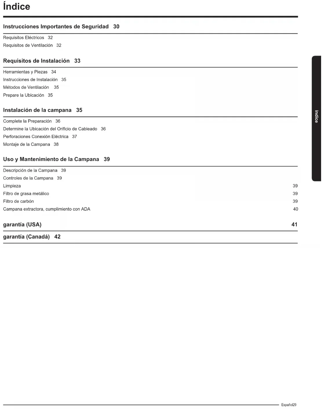 un funcionamiento no deseado. Este aparato digital de clase B cumple con el ICES-003 canadiense. Para productos vendidos en los mercados Estadounidense y Canadiense, sólo los canales 1~11 están disponibles. Usted no puede seleccionar otros canales. Declaración de exposición a la radiación de la IC: Este equipo cumple con los límites para exposición a la radiación establecidos por la IC RSS-102 para ambientes no controlados. Para instalarlo y manejarlo el usuario debe encontrarse a una distancia mínima de 20 centímetros del aparato emisor de la radiación. Este dispositivo y su antena no deben de estar colocados o ser operados en conjunto con ninguna otra antena o transmisor.Español 31 Instrucciones Importantes de Seguridad Instrucciones Importantes de Seguridad ADVERTENCIA PARA REDUCIR EL RIESGO DE INCENDIOS, CHOQUE ELÉCTRICO O LESIONES A PERSONAS, OBSERVE LO SIGUIENTE: ■ Use esta unidad sólo de la manera para la que fue diseñada por el fabricante. Si tiene preguntas, póngase en contacto con el fabricante. ■ Antes de dar servicio o limpiar la unidad,apague el suministro de energía en el panel de servicio y bloquee los medios de desconexión del servicio para evitar que se encienda accidentalmente el suministro de energía. Cuando el medio de desconexión del servicio no se pueda bloquear, sujete de manera segura un dispositivo de advertencia prominente, como podría ser una etiqueta, al panel de servicio. ■ La instalación y el cableado se debe llevar a cabo por una persona(s) calicada(s), de acuerdo con los códigos y estándares aplicables, incluida la construcción ignífuga. ■ Es necesaria una ventilación suciente para la correcta combustión y expulsión de gases por la salida de humos (chimenea) del equipo de combustión de carburante para evitar el contratiro. Siga las directrices de fabricantes de equipos de calefacción y los estándares de seguridad como los publicados por la National Fire Protection Association (NFPA), American Society for Heating, Refrigeration and Air Conditioning Engineers (ASHRAE) y las normativas locales. ■ Al efectuar oricios en una pared o techo, no dañe el cableado eléctrico y otras instalaciones ocultas. ■ Los conductos deben tener ventilación con salida al exterior. PRECAUCIÓN Para usarse sólo en ventilación común. No lo use para ventilar materiales y vapores peligrosos o explosivos. PRECAUCIÓN Para reducir el riesgo de incendio y para ventilar el aire adecuadamente, asegúrese de dirigir el conducto de ventilación hacia el exterior - no ventile el aire de salida a espacios dentro de paredes o techos, áticos, espacios angostos o garajes. ADVERTENCIA PARA REDUCIR EL RIESGO DE INCENDIO, SÓLO USE CONDUCTOS METÁLICOS. PRECAUCIÓN Este aparato no está diseñado para ser utilizado por personas (incluidos niños) con capacidades físicas, sensoriales o mentales reducidas, o con falta de experiencia y conocimientos, a menos que hayan recibido supervisión o instrucciones sobre el uso del aparato por parte de una persona responsable de su seguridad. PRECAUCIÓN Los niños deben ser supervisados para asegurarse de que no juegan con el aparato. ADVERTENCIA Cáncer y Daño Reproductivo - www.P65Warnings.ca.gov ADVERTENCIA PARA REDUCIR EL RIESGO DE INCENDIO PROVOCADO POR GRASA EN LA SUPERFICIE DE LA ESTUFA: ■ Nunca deje las unidades de supercie sin vigilancia cuando estén en ajustes altos. La cocción puede causar humo o reboses de grasa que pueden prender fuego. Caliente el aceite a fuego lento o medio. ■ Siempre ENCIENDA la campana cuando cocine con calor alto o cuando amee alimentos (por ejemplo, crepes Suzette, cerezas Jubileo y ameado de carne de res con pimienta). ■ Limpie los ventiladores con frecuencia. No permita que la grasa se acumule en el ventilador o en el ltro. ■ Use un tamaño de sartén adecuado. Siempre use utensilios de cocción que sean los adecuados para el tamaño del elemento de la supercie. ADVERTENCIA PARA REDUCIR EL RIESGO DE LESIONES A PERSONAS SI SE PRENDE FUEGO EN LA SUPERFICIE DE LA ESTUFA OCASIONADO POR GRASA, OBSERVE LO SIGUIENTE: