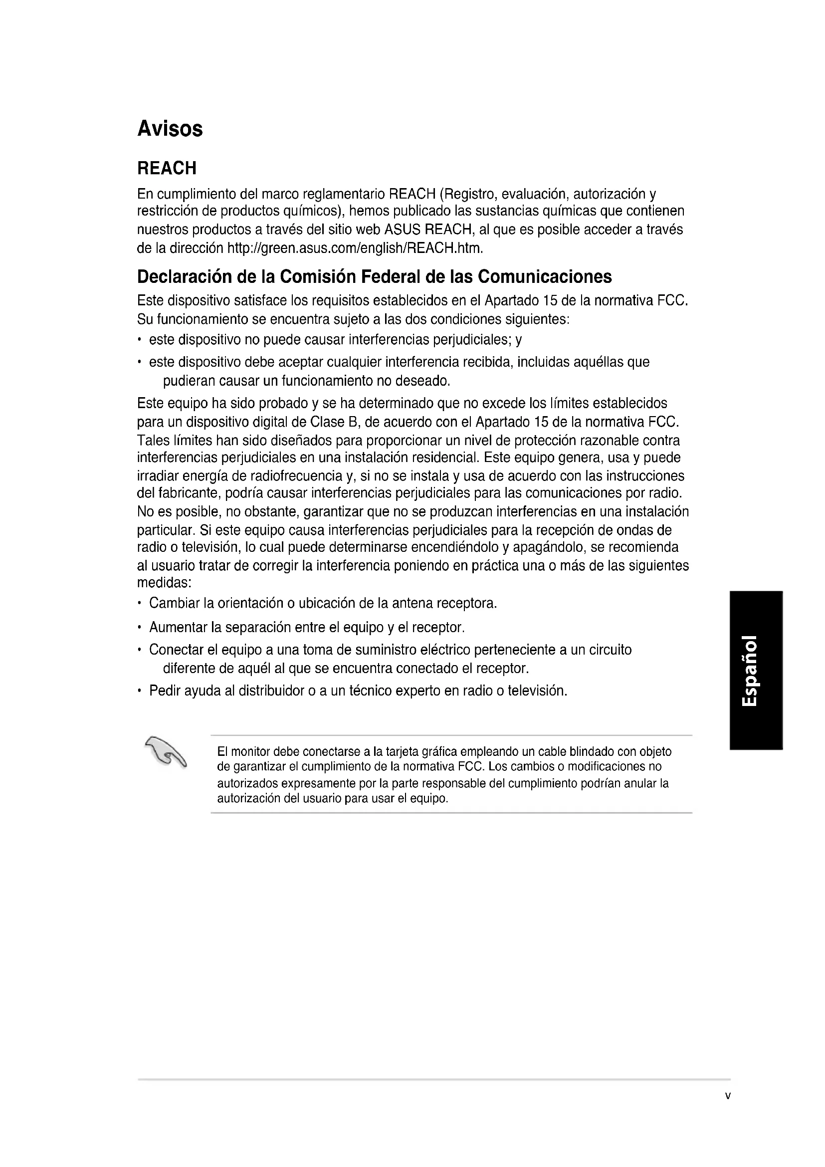 - -19 Capítulo 7 Resolución de problemas Resolución de problemas -1v Español Español Español Español Avisos REACH En cumplimiento del marco reglamentario REACH (Registro, evaluación, autorización y restricción de productos químicos), hemos publicado las sustancias químicas que contienen nuestros productos a través del sitio web ASUS REACH, al que es posible acceder a través de la dirección http://green.asus.com/english/REACH.htm. Declaración de la Comisión Federal de las Comunicaciones Este dispositivo satisface los requisitos establecidos en el Apartado 15 de la normativa FCC. Su funcionamiento se encuentra sujeto a las dos condiciones siguientes: p. 7