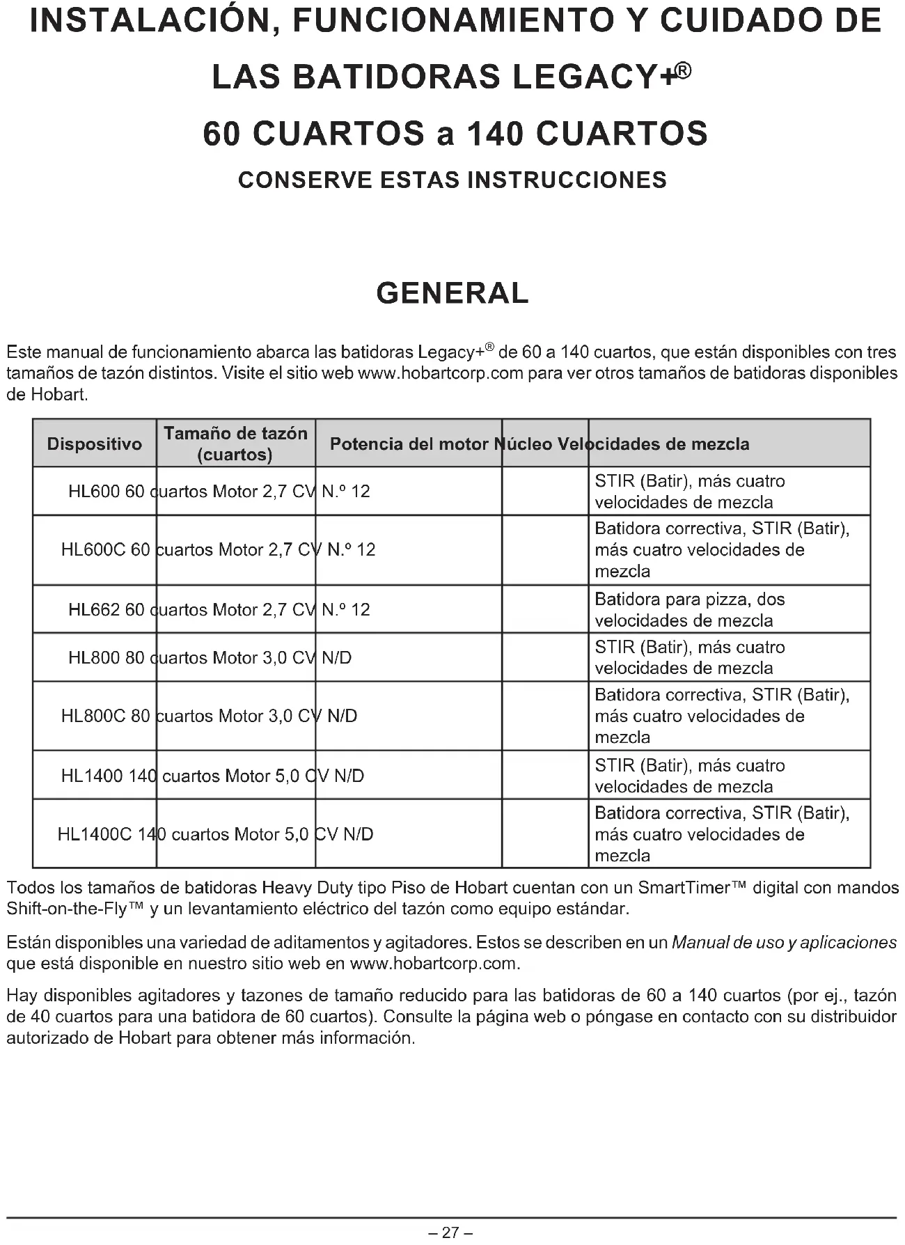 de 60 a 140 cuartos, que están disponibles con tres tamaños de tazón distintos. Visite el sitio web www.hobartcorp.com para ver otros tamaños de batidoras disponibles de Hobart. Dispositivo Tamaño de tazón (cuartos) Potencia del motor Núcleo Velocidades de mezcla HL600 60 cuartos Motor 2,7 CV N.º 12 STIR (Batir), más cuatro velocidades de mezcla HL600C 60 cuartos Motor 2,7 CV N.º 12 Batidora correctiva, STIR (Batir), más cuatro velocidades de mezcla HL662 60 cuartos Motor 2,7 CV N.º 12 Batidora para pizza, dos velocidades de mezcla HL800 80 cuartos Motor 3,0 CV N/D STIR (Batir), más cuatro velocidades de mezcla HL800C 80 cuartos Motor 3,0 CV N/D Batidora correctiva, STIR (Batir), más cuatro velocidades de mezcla HL1400 140 cuartos Motor 5,0 CV N/D STIR (Batir), más cuatro velocidades de mezcla HL1400C 140 cuartos Motor 5,0 CV N/D Batidora correctiva, STIR (Batir), más cuatro velocidades de mezcla Todos los tamaños de batidoras Heavy Duty tipo Piso de Hobart cuentan con un SmartTimer™ digital con mandos Shift-on-the-Fly™ y un levantamiento eléctrico del tazón como equipo estándar. Están disponibles una variedad de aditamentos y agitadores. Estos se describen en un Manual de uso y aplicaciones que está disponible en nuestro sitio web en www.hobartcorp.com. Hay disponibles agitadores y tazones de tamaño reducido para las batidoras de 60 a 140 cuartos (por ej., tazón de 40 cuartos para una batidora de 60 cuartos). Consulte la página web o póngase en contacto con su distribuidor autorizado de Hobart para obtener más información.– 28 –
