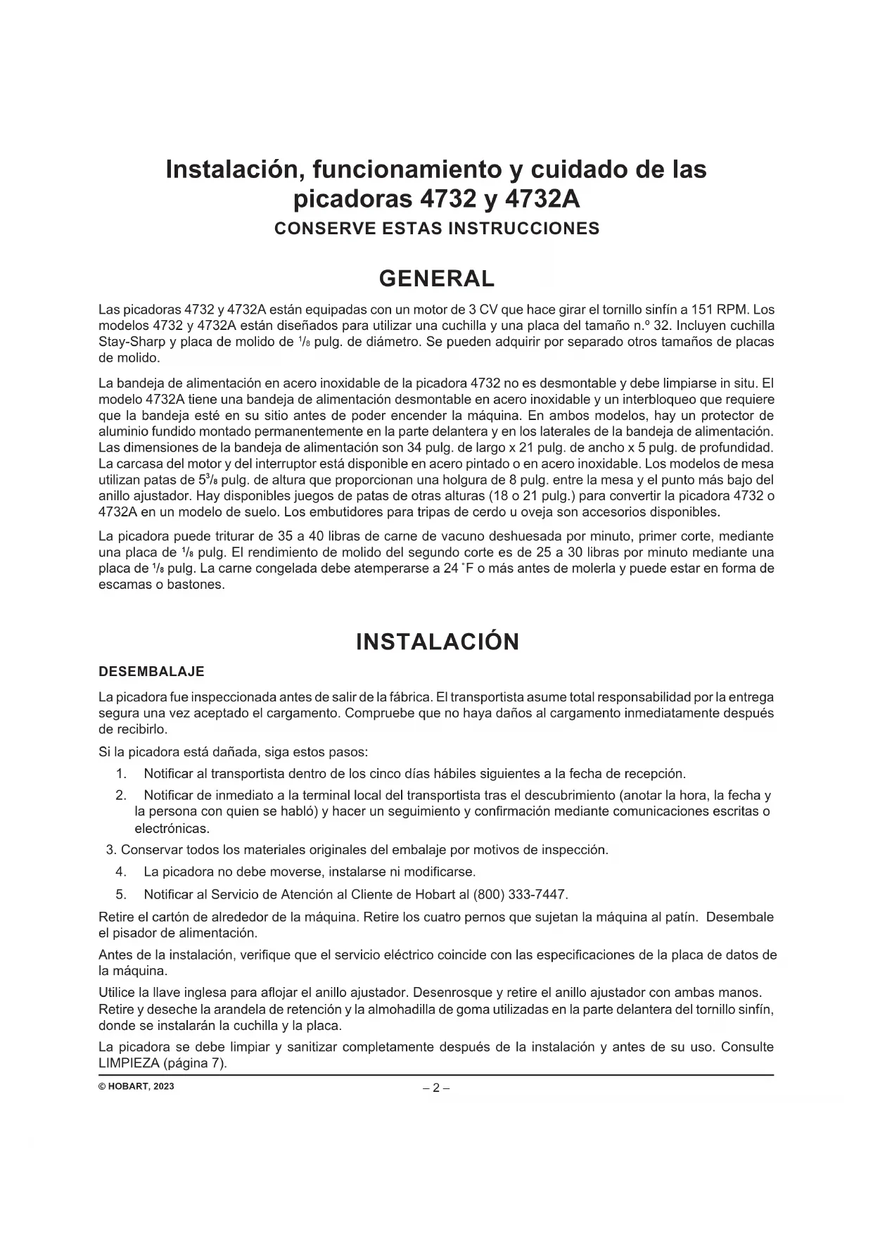 GENERAL Las picadoras 4732 y 4732A están equipadas con un motor de 3 CV que hace girar el tornillo sinfín a 151 RPM. Los modelos 4732 y 4732A están diseñados para utilizar una cuchilla y una placa del tamaño n.º 32. Incluyen cuchilla Stay-Sharp y placa de molido de