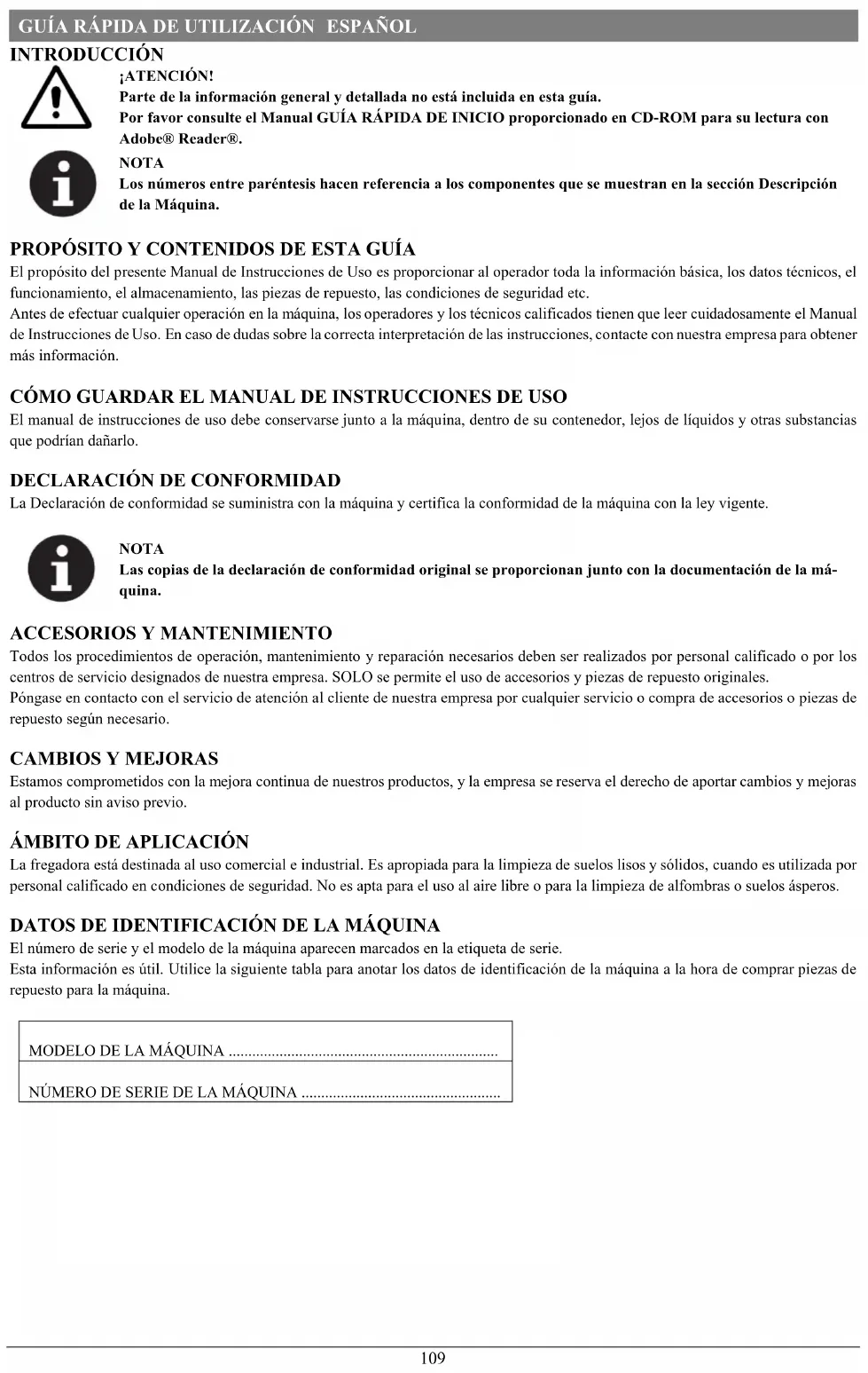La fregadora está destinada al uso comercial e industrial. Es apropiada para la limpieza de suelos lisos y sólidos, cuando es utilizada por personal calificado en condiciones de seguridad. No es apta para el uso al aire libre o para la limpieza de alfombras o suelos ásperos. DATOS DE IDENTIFICACIÓN DE LA MÁQUINA El número de serie y el modelo de la máquina aparecen marcados en la etiqueta de serie. Esta información es útil. Utilice la siguiente tabla para anotar los datos de identificación de la máquina a la hora de comprar piezas de repuesto para la máquina. MODELO DE LA MÁQUINA .....................................................................