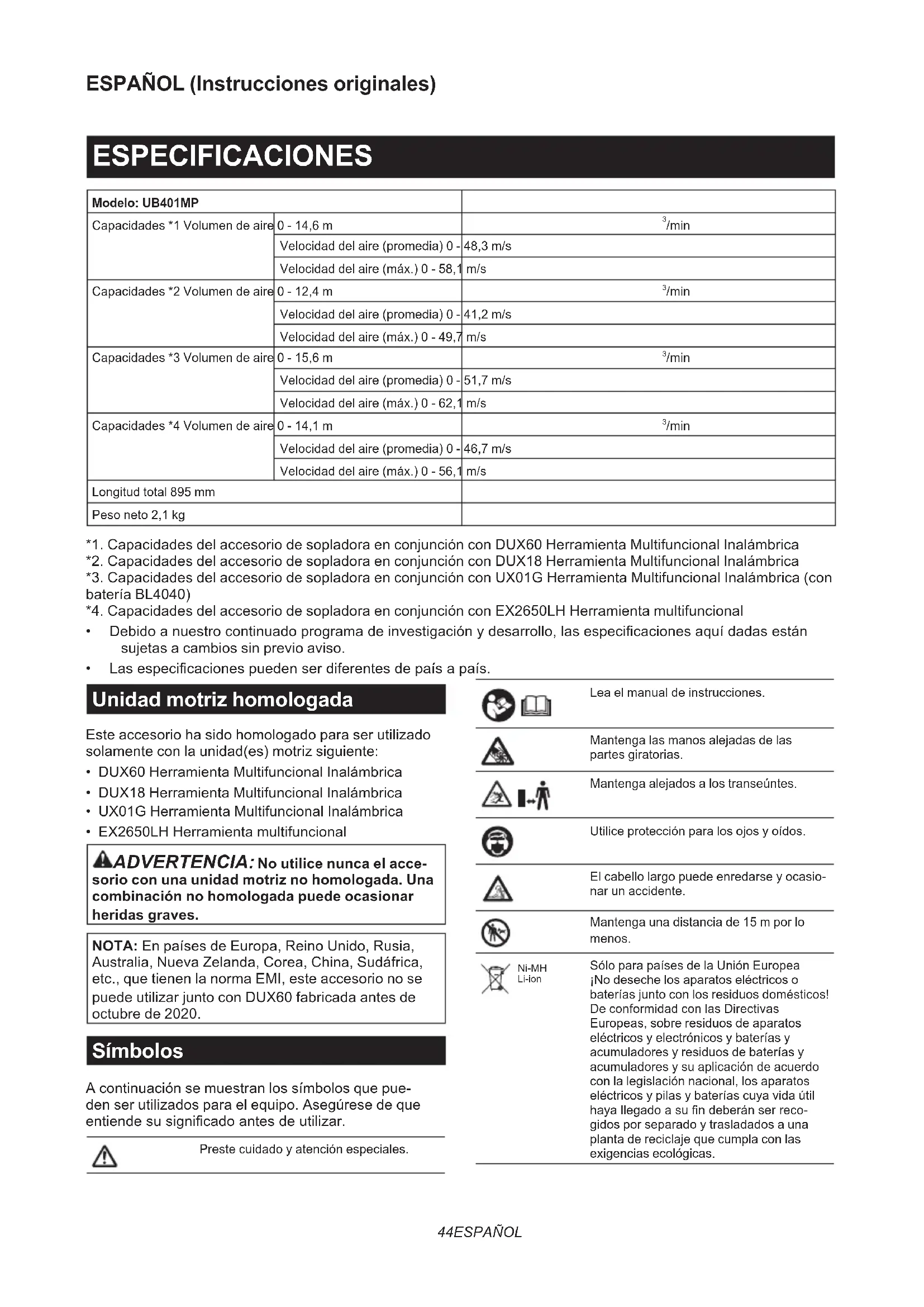 - EX2650LH Herramienta multifuncional ADVERTENCIA: No utilice nunca el acce- sorio con una unidad motriz no homologada. Una combinación no homologada puede ocasionar heridas graves. NOTA: En países de Europa, Reino Unido, Rusia, Australia, Nueva Zelanda, Corea, China, Sudáfrica, etc., que tienen la norma EMI, este accesorio no se puede utilizar junto con DUX60 fabricada antes de octubre de 2020. Símbolos A continuación se muestran los símbolos que pue- den ser utilizados para el equipo. Asegúrese de que entiendesusignicadoantesdeutilizar. Preste cuidado y atención especiales. Lea el manual de instrucciones. Mantenga las manos alejadas de las partes giratorias. Mantenga alejados a los transeúntes. Utilice protección para los ojos y oídos. El cabello largo puede enredarse y ocasio- nar un accidente. Mantenga una distancia de 15 m por lo menos. Ni-MH Li-ion Sólo para países de la Unión Europea ¡No deseche los aparatos eléctricos o baterías junto con los residuos domésticos! De conformidad con las Directivas Europeas, sobre residuos de aparatos eléctricos y electrónicos y baterías y acumuladores y residuos de baterías y acumuladores y su aplicación de acuerdo con la legislación nacional, los aparatos eléctricos y pilas y baterías cuya vida útil hayallegadoasundeberánserreco- gidos por separado y trasladados a una planta de reciclaje que cumpla con las exigencias ecológicas.45 ESPAÑOL Uso previsto Esteaccesoriohasidodiseñadoparalasolanalidad de soplar el polvo en conjunción con una unidad motriz homologada. No utilice nunca el accesorio para otras nalidades.Abusardelaccesoriopuedeocasionar heridas graves. Declaración CE de conformidad Para países europeos solamente Nosotros como los fabricantes: Makita Europe N.V., Dirección comercial: Jan-Baptist Vinkstraat 2 3070 Kortenberg BÉLGICA. Autorizamos a Hiroshi Tsujimura para la compilación del archivo técnico y declaramos ante nuestra sola responsabilidad que el(los) producto(s); Designación: Accesorio de Sopladora. Designación de tipo(s): UB401MP. Cumple todas las provisiones pertinentes de 2006/42/ EC y también cumple todas las provisiones pertinentes de las Directivas EC/EU siguientes: 2000/14/EC y están fabricadosdeacuerdoconlosestándaresunicados siguientes: EN 15503:2009+A1:2013+A2:2015, EN 50636-2-100:2014. Lugar y fecha de la declaración: Kortenberg, Bélgica.