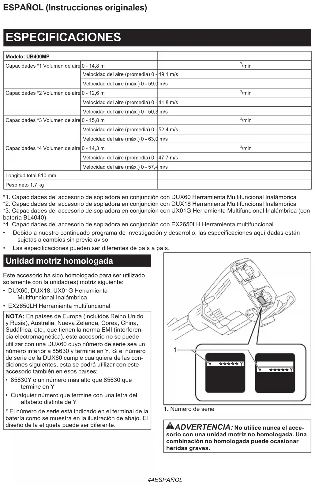 /min Velocidad del aire (promedia) 0 - 47,7 m/sVelocidad del aire (máx.) 0 - 57,4 m/sLongitud total 810 mmPeso neto 1,7 kg*1. Capacidades del accesorio de sopladora en conjunción con DUX60 Herramienta Multifuncional Inalámbrica*2. Capacidades del accesorio de sopladora en conjunción con DUX18 Herramienta Multifuncional Inalámbrica*3. Capacidades del accesorio de sopladora en conjunción con UX01G Herramienta Multifuncional Inalámbrica (con batería BL4040)*4. Capacidades del accesorio de sopladora en conjunción con EX2650LH Herramienta multifuncional• Debidoanuestrocontinuadoprogramadeinvestigaciónydesarrollo,lasespecicacionesaquídadasestánsujetas a cambios sin previo aviso.• Lasespecicacionespuedenserdiferentesdepaísapaís. Unidad motriz homologada Este accesorio ha sido homologado para ser utilizado solamente con la unidad(es) motriz siguiente:• DUX60, DUX18, UX01G Herramienta Multifuncional Inalámbrica• EX2650LH Herramienta multifuncionalNOTA: En países de Europa (incluidos Reino Unido y Rusia), Australia, Nueva Zelanda, Corea, China, Sudáfrica, etc., que tienen la norma EMI (interferen-cia electromagnética), este accesorio no se puede utilizar con una DUX60 cuyo número de serie sea un número inferior a 85630 y termine en Y. Si el número de serie de la DUX60 cumple cualquiera de las con-diciones siguientes, esta se podrá utilizar con este accesorio también en esos países:• 85630Y o un número más alto que 85630 que termine en Y• Cualquier número que termine con una letra del alfabeto distinta de Y* El número de serie está indicado en el terminal de la batería como se muestra en la ilustración de abajo. El diseño de la etiqueta puede ser diferente.
