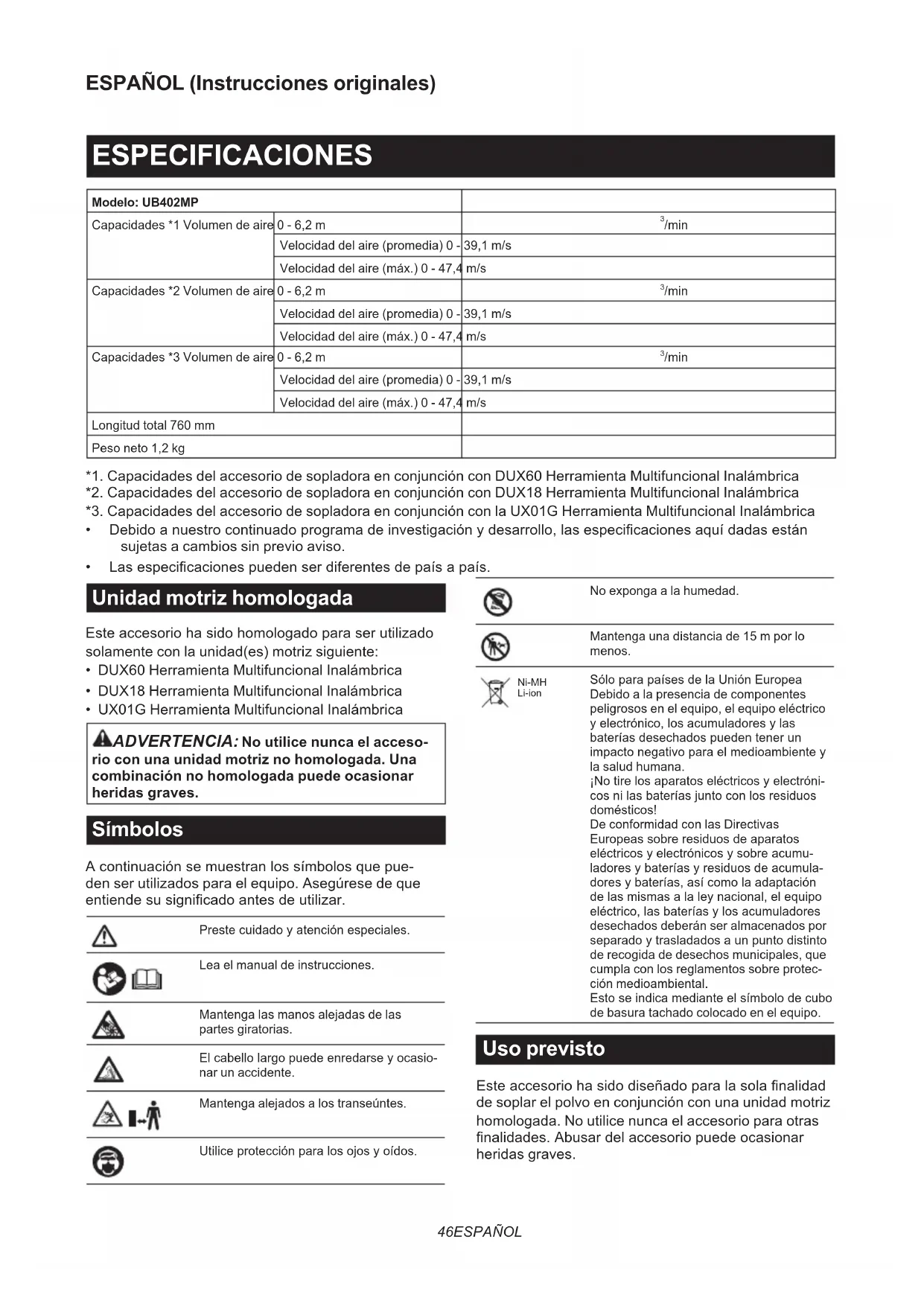 - UX01G Herramienta Multifuncional Inalámbrica ADVERTENCIA: No utilice nunca el acceso- rio con una unidad motriz no homologada. Una combinación no homologada puede ocasionar heridas graves. Símbolos Acontinuaciónsemuestranlossímbolosquepue- den ser utilizados para el equipo. Asegúrese de que entiendesusignicadoantesdeutilizar. Prestecuidadoyatenciónespeciales. Lea el manual de instrucciones. Mantenga las manos alejadas de las partes giratorias. Elcabellolargopuedeenredarseyocasio- nar un accidente. Mantenga alejados a los transeúntes. Utiliceprotecciónparalosojosyoídos. No exponga a la humedad. Mantenga una distancia de 15 m por lo menos. Ni-MH Li-ion SóloparapaísesdelaUniónEuropea Debido a la presencia de componentes peligrosos en el equipo, el equipo eléctrico yelectrónico,losacumuladoresylas bateríasdesechadospuedentenerun impactonegativoparaelmedioambientey la salud humana. ¡Notirelosaparatoseléctricosyelectróni- cosnilasbateríasjuntoconlosresiduos domésticos! De conformidad con las Directivas Europeassobreresiduosdeaparatos eléctricosyelectrónicosysobreacumu- ladoresybateríasyresiduosdeacumula- doresybaterías,asícomolaadaptación delasmismasalaleynacional,elequipo eléctrico,lasbateríasylosacumuladores desechados deberán ser almacenados por separadoytrasladadosaunpuntodistinto de recogida de desechos municipales, que cumpla con los reglamentos sobre protec- ción medioambiental. Estoseindicamedianteelsímbolodecubo de basura tachado colocado en el equipo. Uso previsto Esteaccesoriohasidodiseñadoparalasolanalidad de soplar el polvo en conjunción con una unidad motriz homologada. No utilice nunca el accesorio para otras nalidades.Abusardelaccesoriopuedeocasionar heridas graves.47 ESPAÑOL Declaración CE de conformidad Para países europeos solamente Nosotros como los fabricantes: Makita Europe N.V., Dirección comercial: Jan-Baptist Vinkstraat 2 3070 Kortenberg BÉLGICA. Autorizamos a Hiroshi Tsujimuraparalacompilacióndelarchivotécnicoy declaramos ante nuestra sola responsabilidad que el(los)producto(s); Designación: Accesorio de Sopladora. Designación de tipo(s): UB402MP. Cumple todas las provisiones pertinentes de 2006/42/ ECytambiéncumpletodaslasprovisionespertinentes delasDirectivasEC/EUsiguientes:2000/14/ECyestán fabricadosdeacuerdoconlosestándaresunicados siguientes: EN 60335-1:2012+A11:2014+A13:2017+A 1:2019+A14:2019+A2:2019, EN 50636-2-100:2014. Lugaryfechadeladeclaración:Kortenberg, Bélgica.