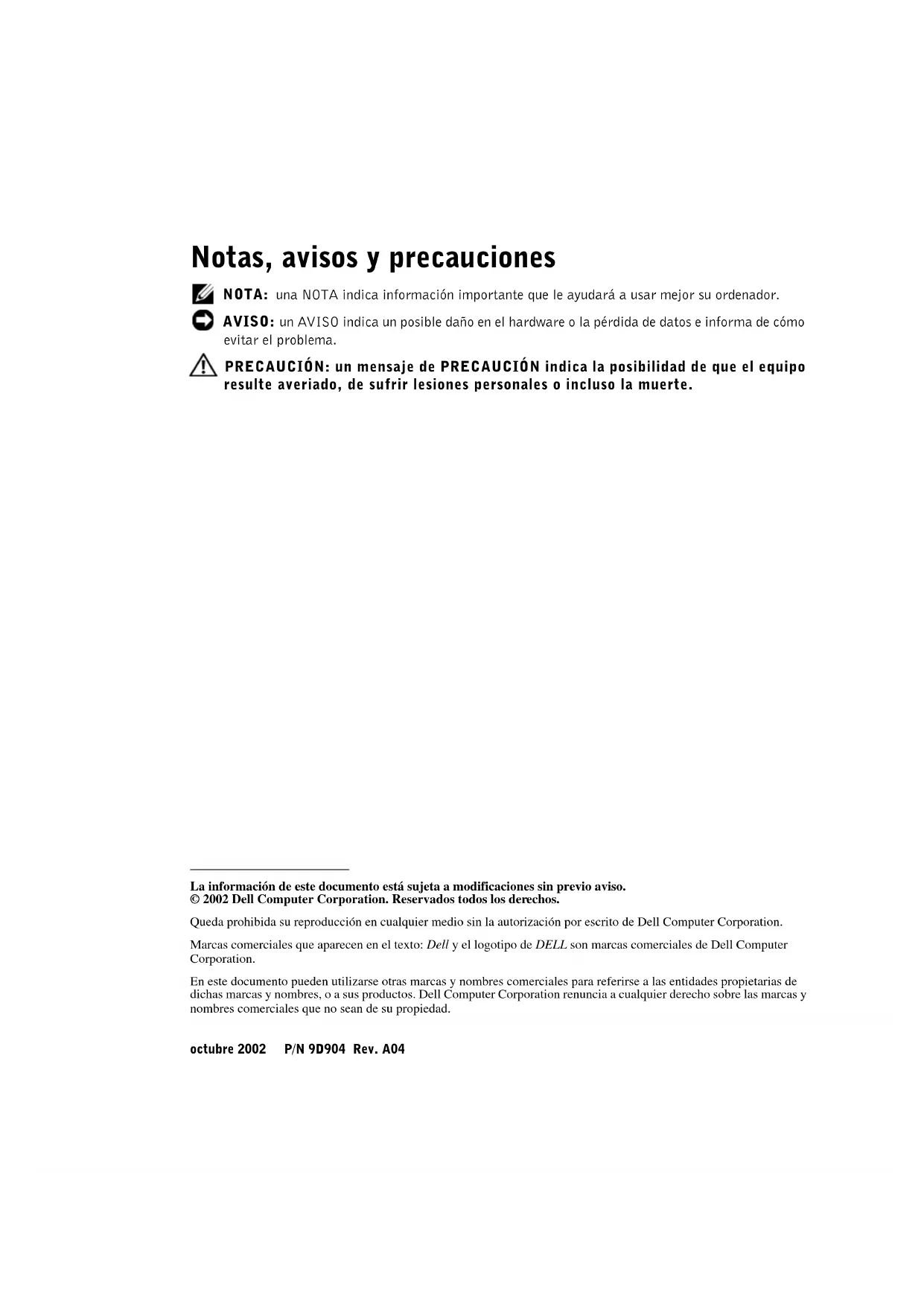 Entre en el programa de configuración del sistema (System Setup) y asegúrese de que las categorías del microprocesador coinciden con la nueva configuración del sistema. Si desea más información sobre el programa de configuración del sistema, consulte la Guía del usuario. 19 Ejecute los diagnósticos del sistema para verificar que el nuevo microprocesador está funcionando correctamente. Consulte la Guía de instalación y resolución de problemas para obtener información sobre la ejecución de diagnósticos y resolución de problemas que pudieran surgir. 9D904sb4.fm Page 6 Tuesday, October 1, 2002 10:45 PM9D904am4.fm Page 1 Monday, October 7, 2002 3:31 PMwww.dell.com | support.dell.com 09D904A04 Printed in the U.S.A. Imprimé aux Etats-Unis. Gedruckt in U.S.A. Impreso en EE.UU. P/N 9D904 Rev. A04 9D904am4.fm Page 2 Monday, October 7, 2002 3:31 PM