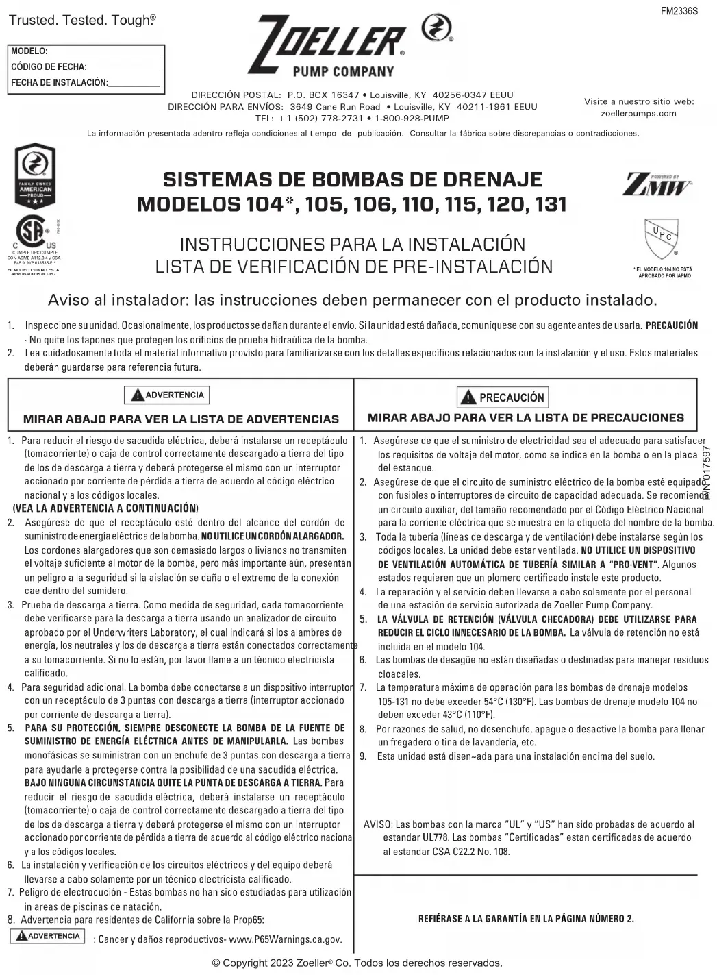 MODEL 105/106/110/115/120/131 MODELOS 105/110/115/120/131 MODELO 1104 Esta es una traducción de las instrucciones de instalación originales. © Copyright 2023 Zoeller Co. Todos los derechos reservados.POMPES DE VIDANGE MODÈLES 104*, 105, 106, 110, 115, 120, 131