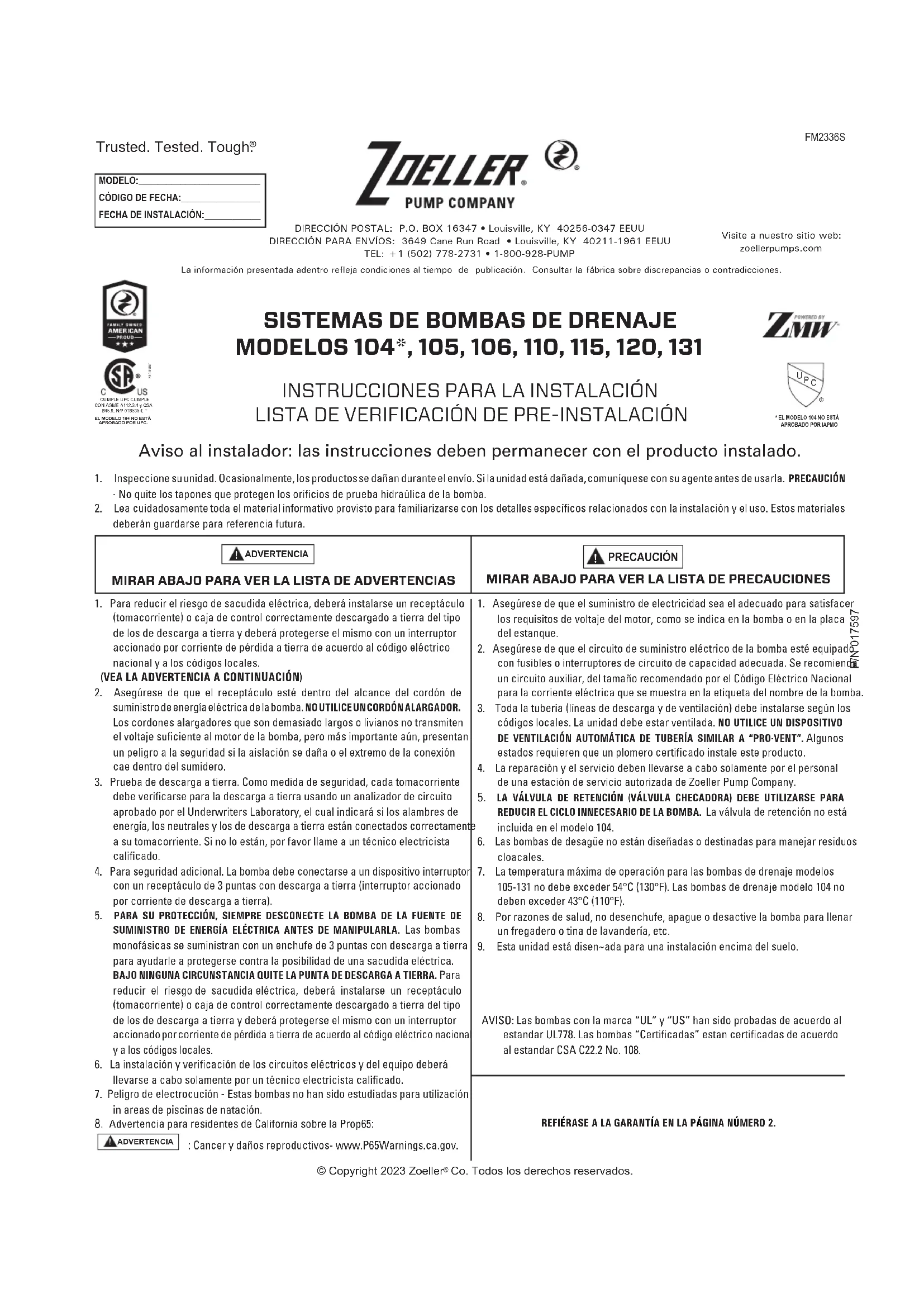 PRECAUCIÓN MIRAR ABAJO PARA VER LA LISTA DE PRECAUCIONES REFIÉRASE A LA GARANTÍA EN LA PÁGINA NÚMERO 2. AVISO: Las bombas con la marca “UL” y “US” han sido probadas de acuerdo al estandar UL778. Las bombas “Certicadas” estan certicadas de acuerdo al estandar CSA C22.2 No. 108. La información presentada adentro refleja condiciones al tiempo de publicación. Consultar la fábrica sobre discrepancias o contradicciones. DIRECCIÓN POSTAL: P.O. BOX 16347 • Louisville, KY 40256-0347 EEUUDIRECCIÓN PARA ENVÍOS: 3649 Cane Run Road • Louisville, KY 40211-1961 EEUUTEL: +1 (502) 778-2731 • 1-800-928-PUMPVisite a nuestro sitio web:zoellerpumps.com Trusted. Tested. Tough.