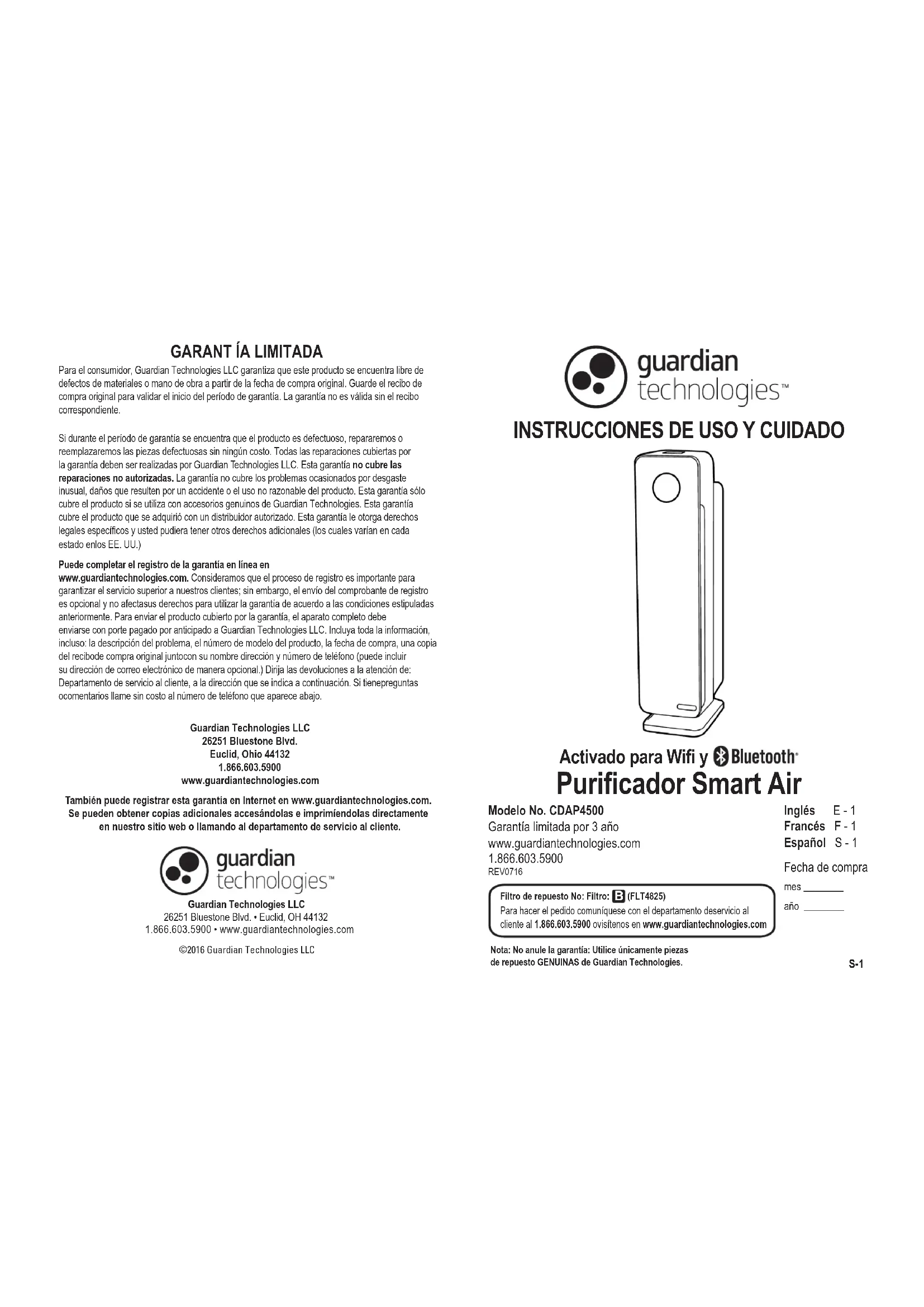 Filtro de repuesto No: Filtro: (FLT4825)Para hacer el pedido comuníquese con el departamento deservicio al cliente al 1.866.603.5900 ovisítenos en www.guardiantechnologies.com Inglés E - 1Francés F - 1Español S - 1Fecha de comprames ________año ________©2016 Guardian Technologies LLCGuardian Technologies LLC26251 Bluestone Blvd. • Euclid, OH 441321.866.603.5900 • www.guardiantechnologies.com